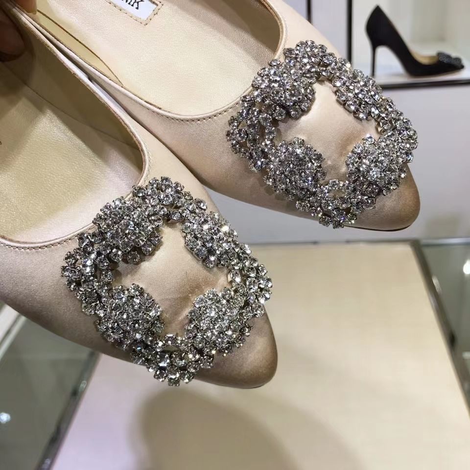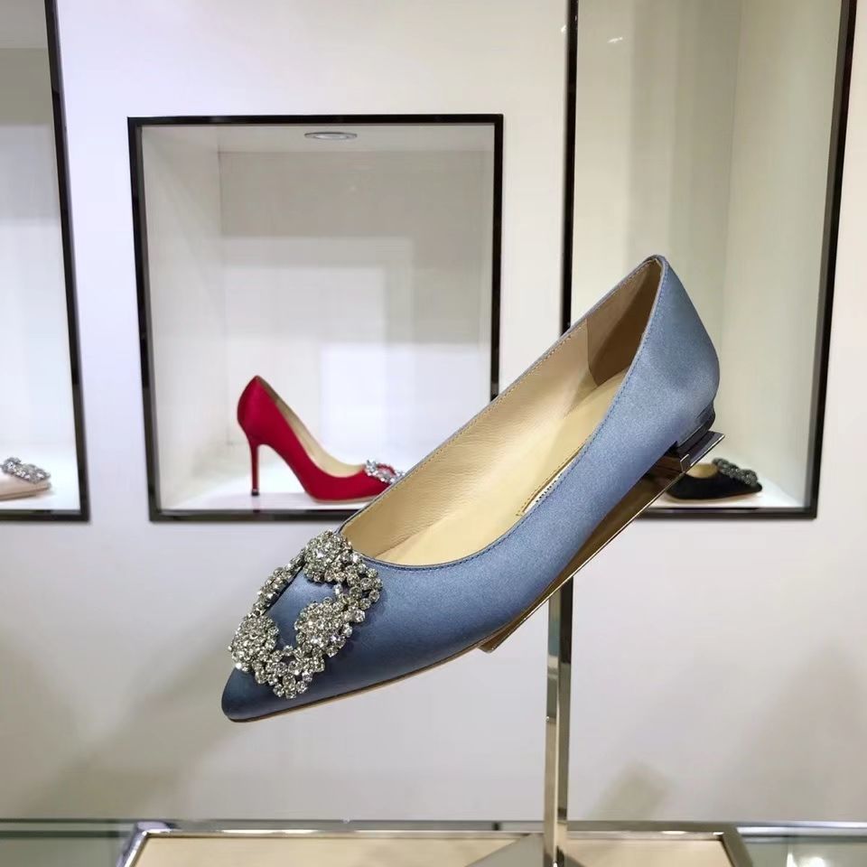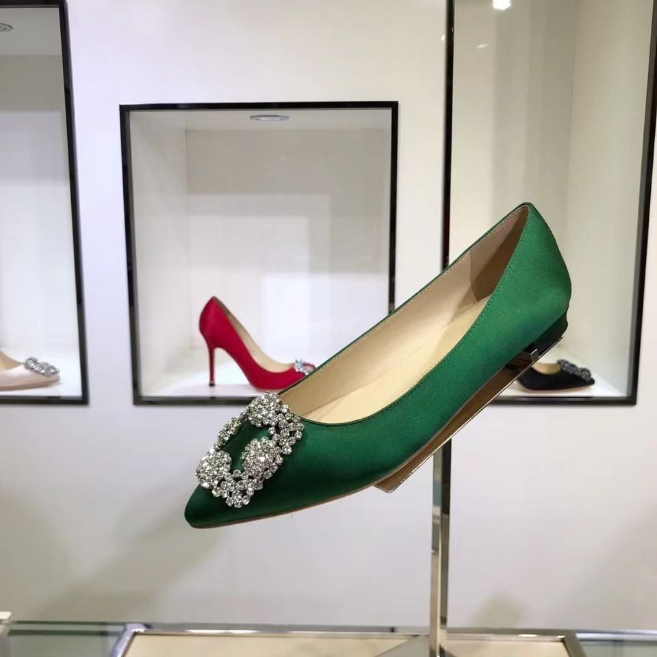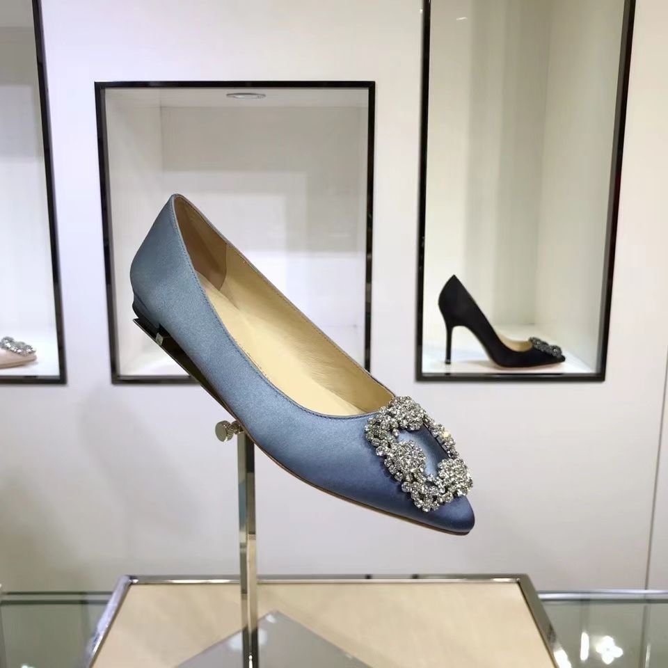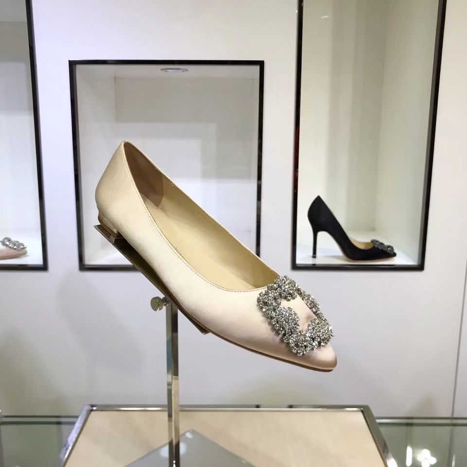 Manolo Blahnikˉ flat bottom women's summer new pointed toe satin wedding shoes shallow mouth comfortable scoop shoes all-match square buckle rhinestone flat heel