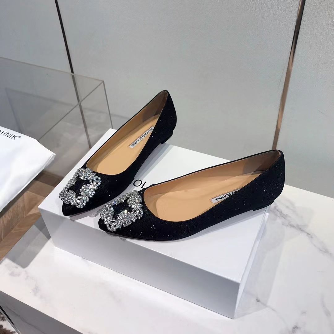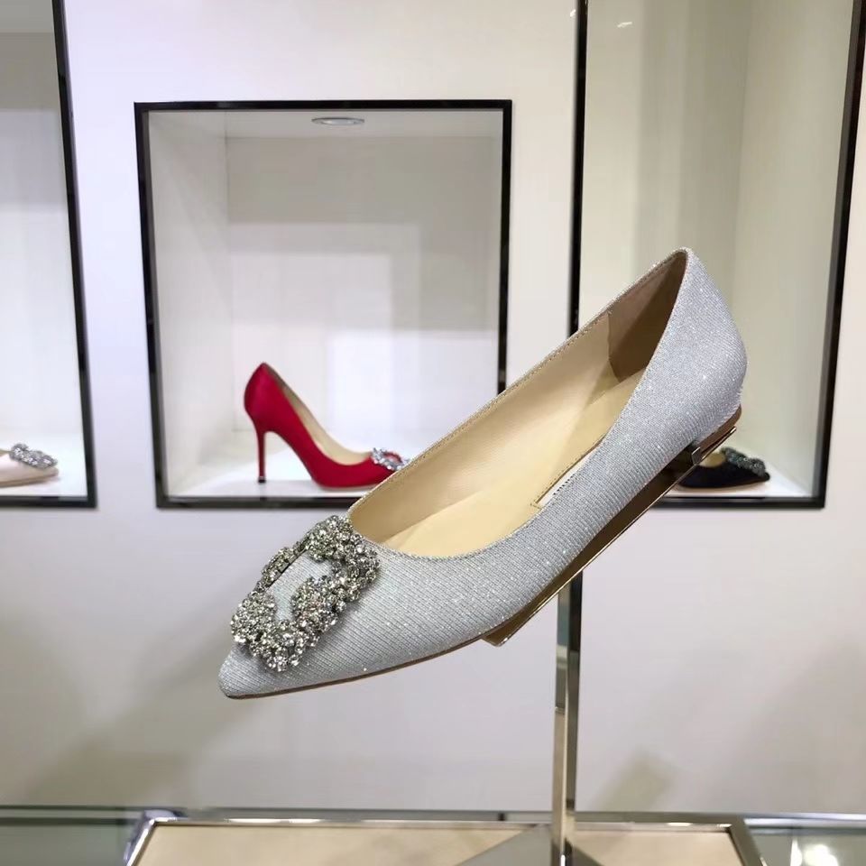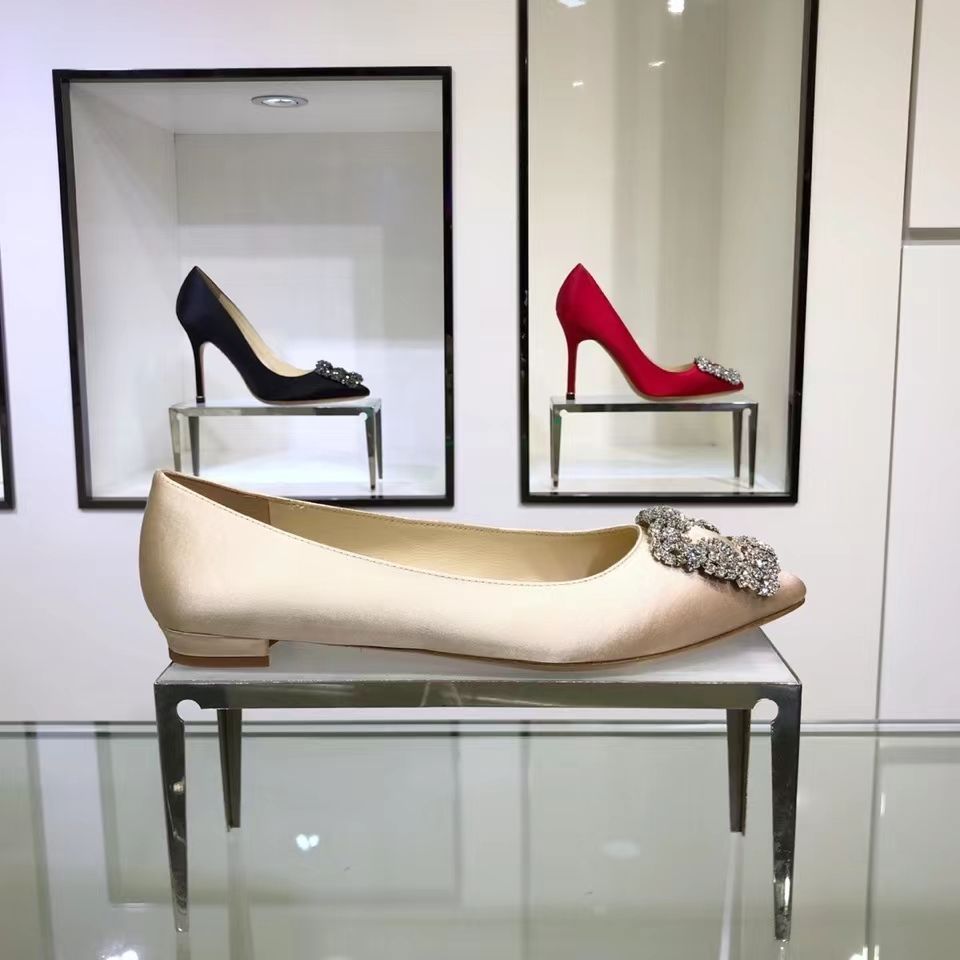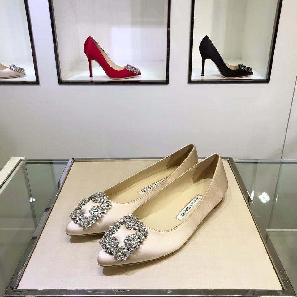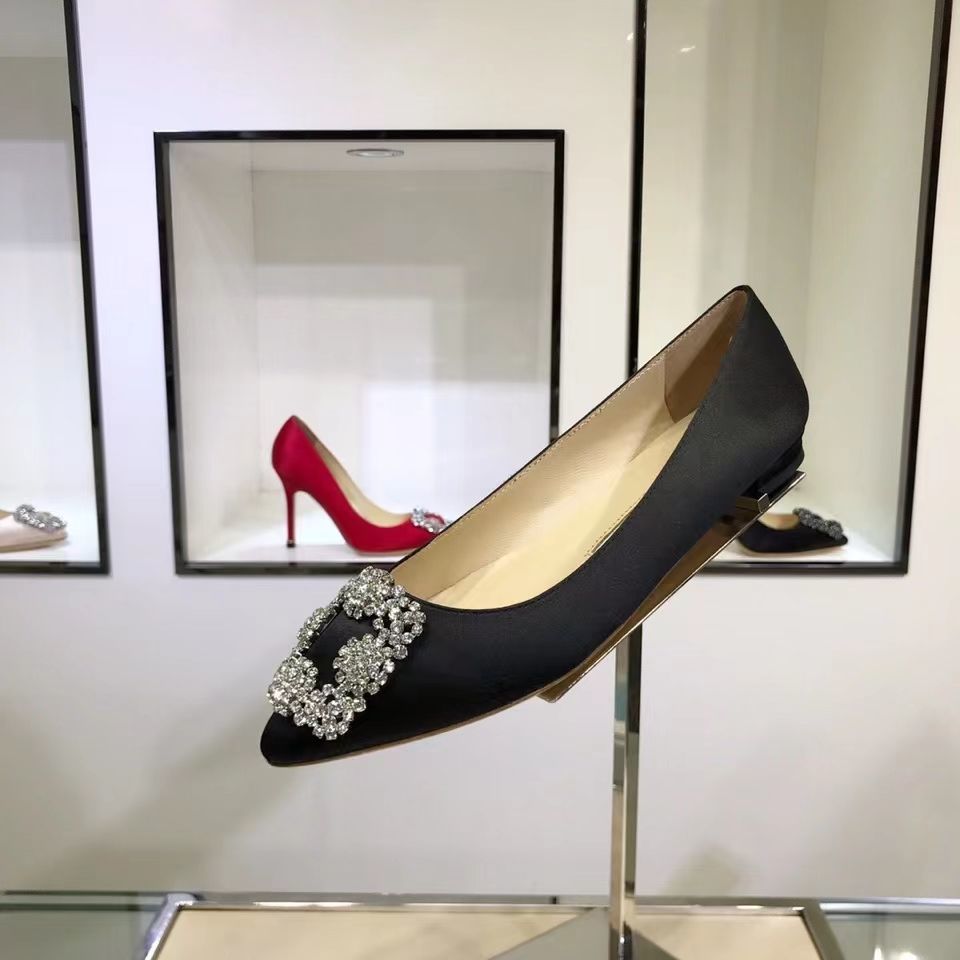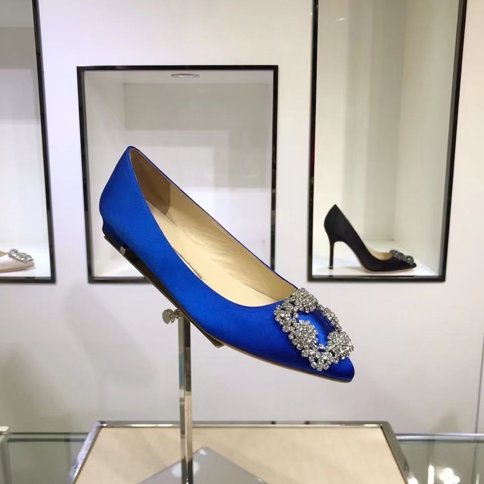 Manolo Blahnikˉ flat bottom women's summer new pointed toe satin wedding shoes shallow mouth comfortable scoop shoes all-match square buckle rhinestone flat heel