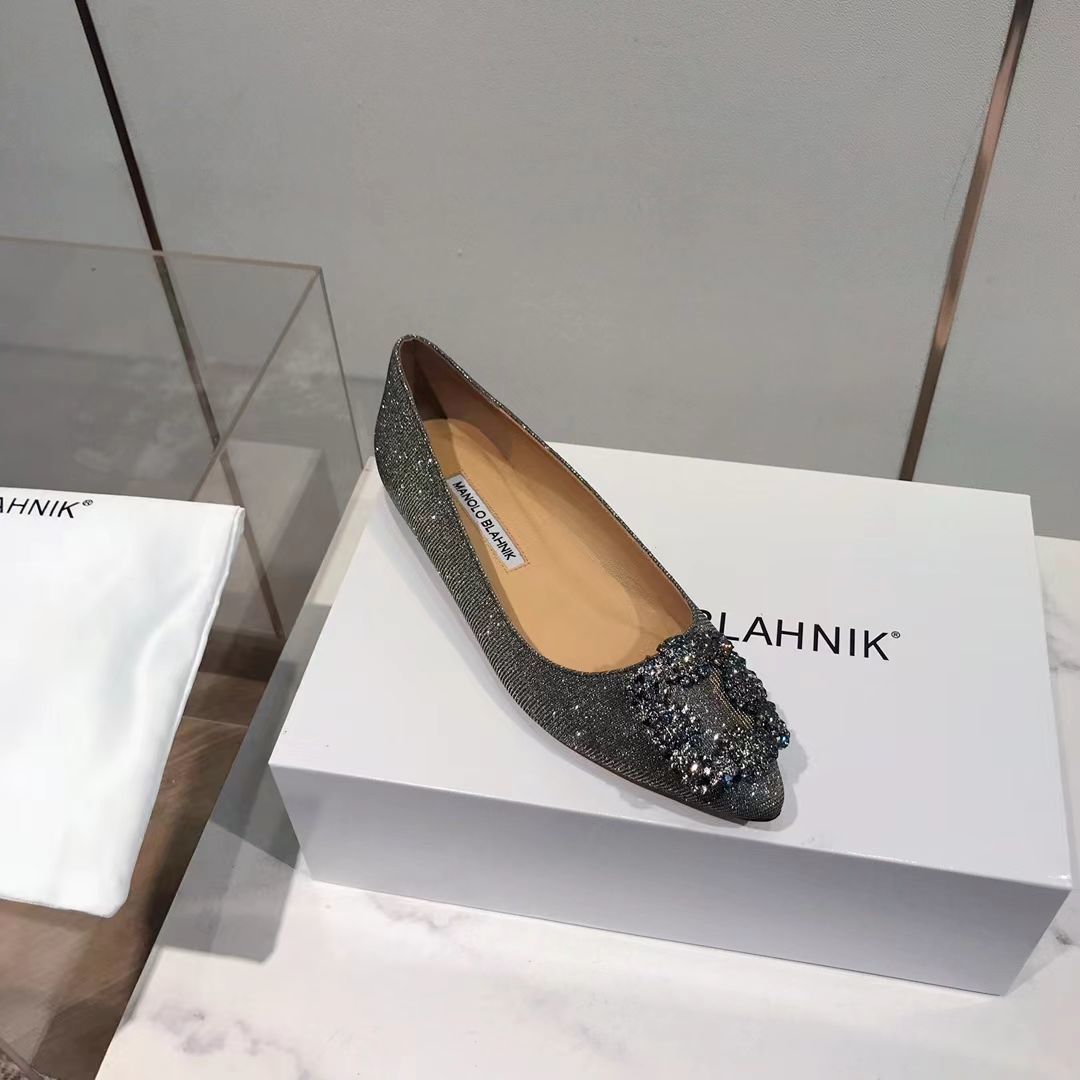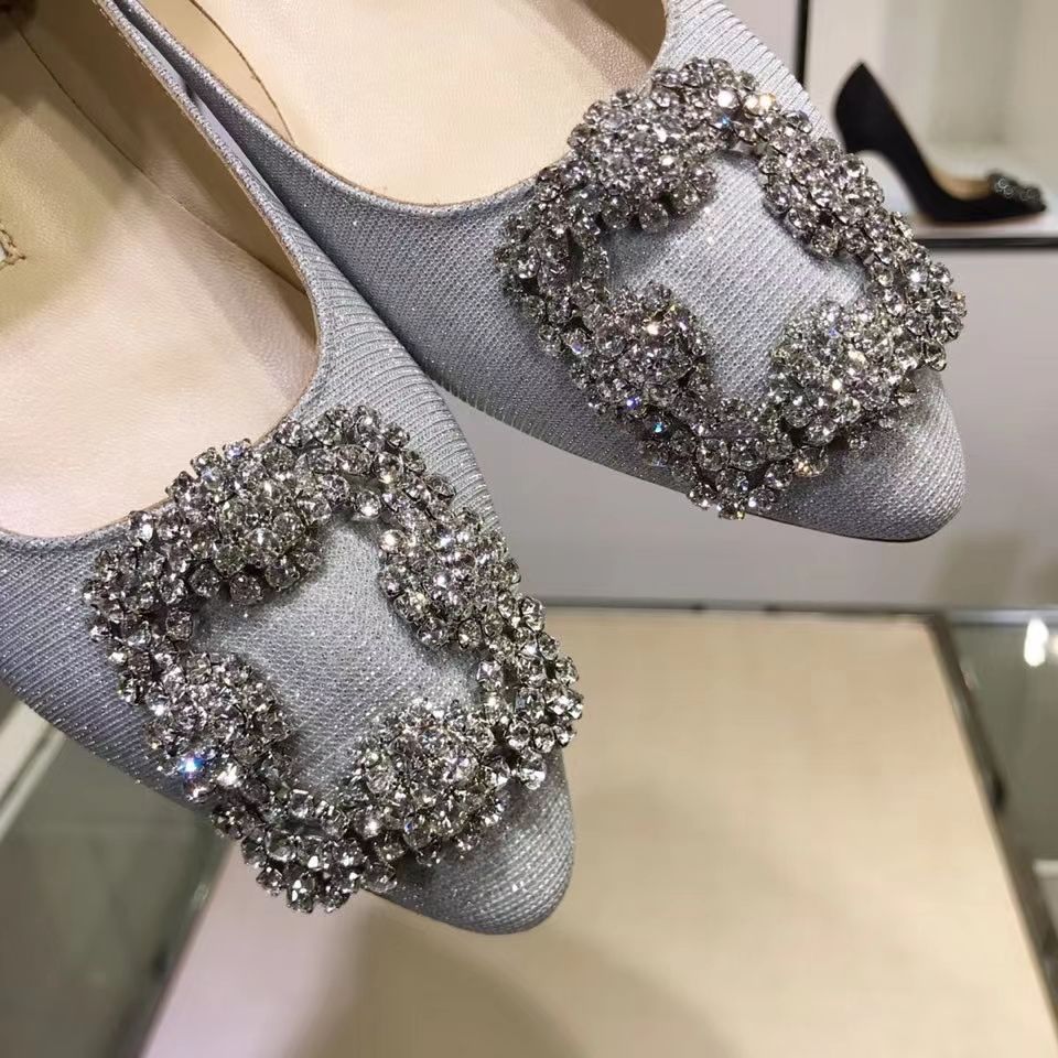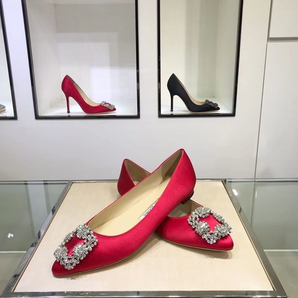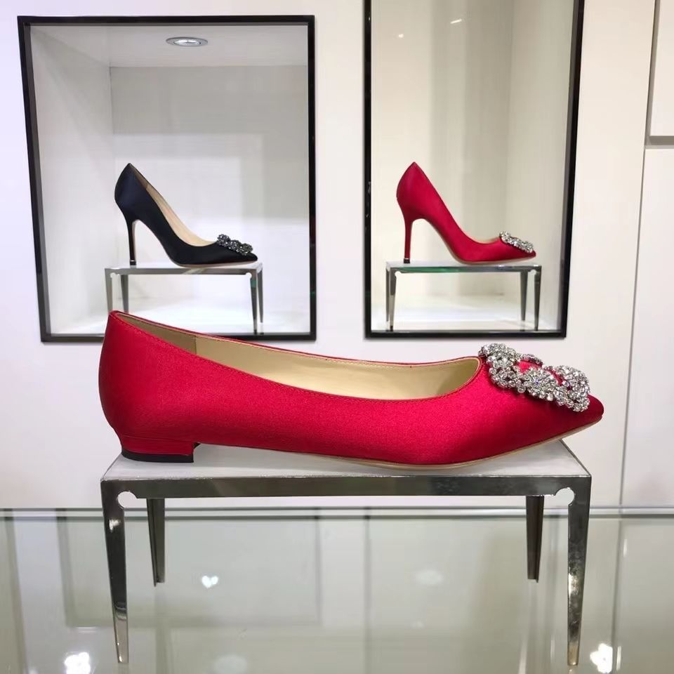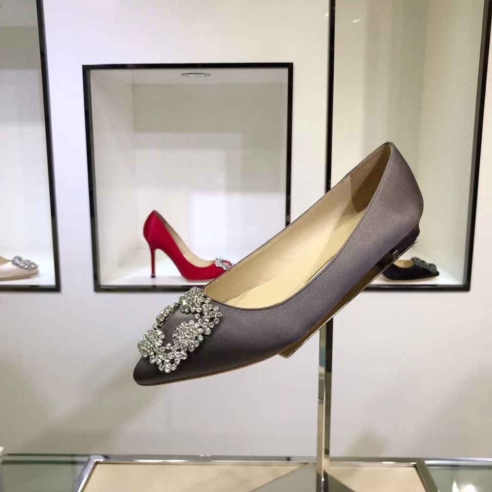 Manolo Blahnikˉ flat bottom women's summer new pointed toe satin wedding shoes shallow mouth comfortable scoop shoes all-match square buckle rhinestone flat heel