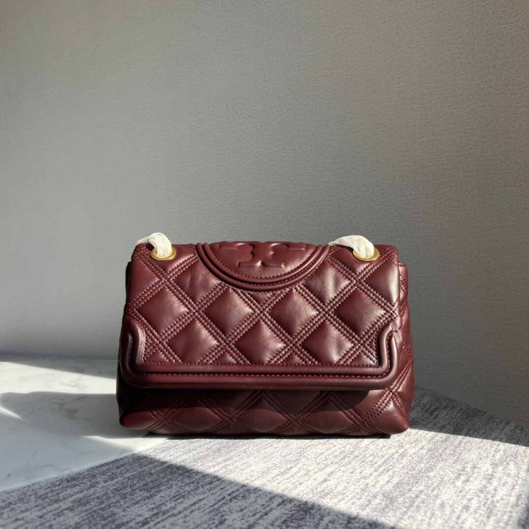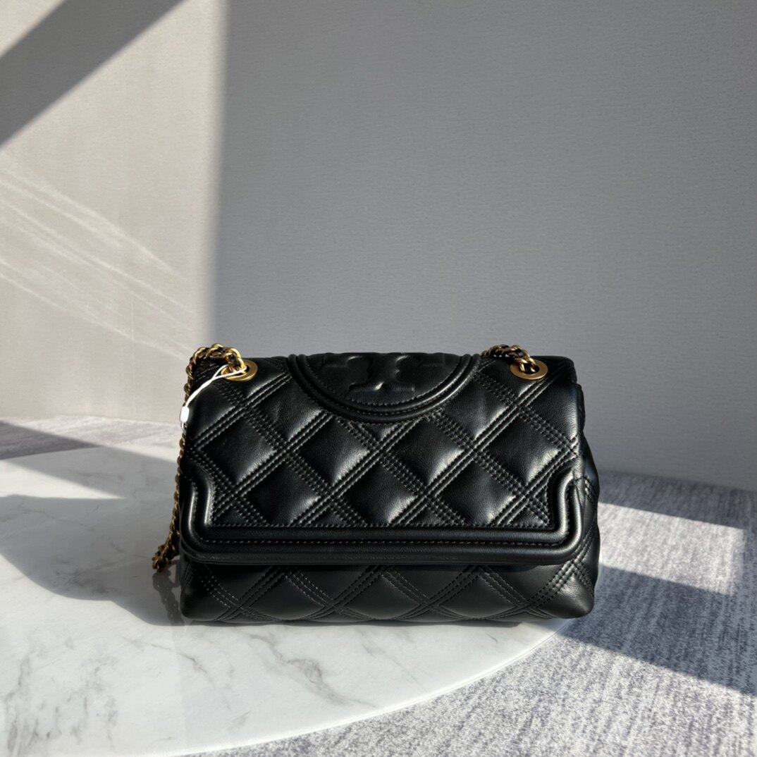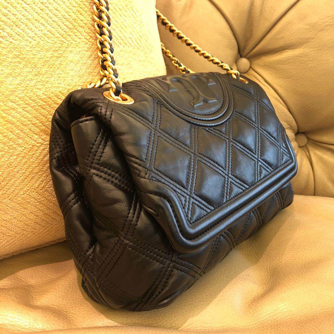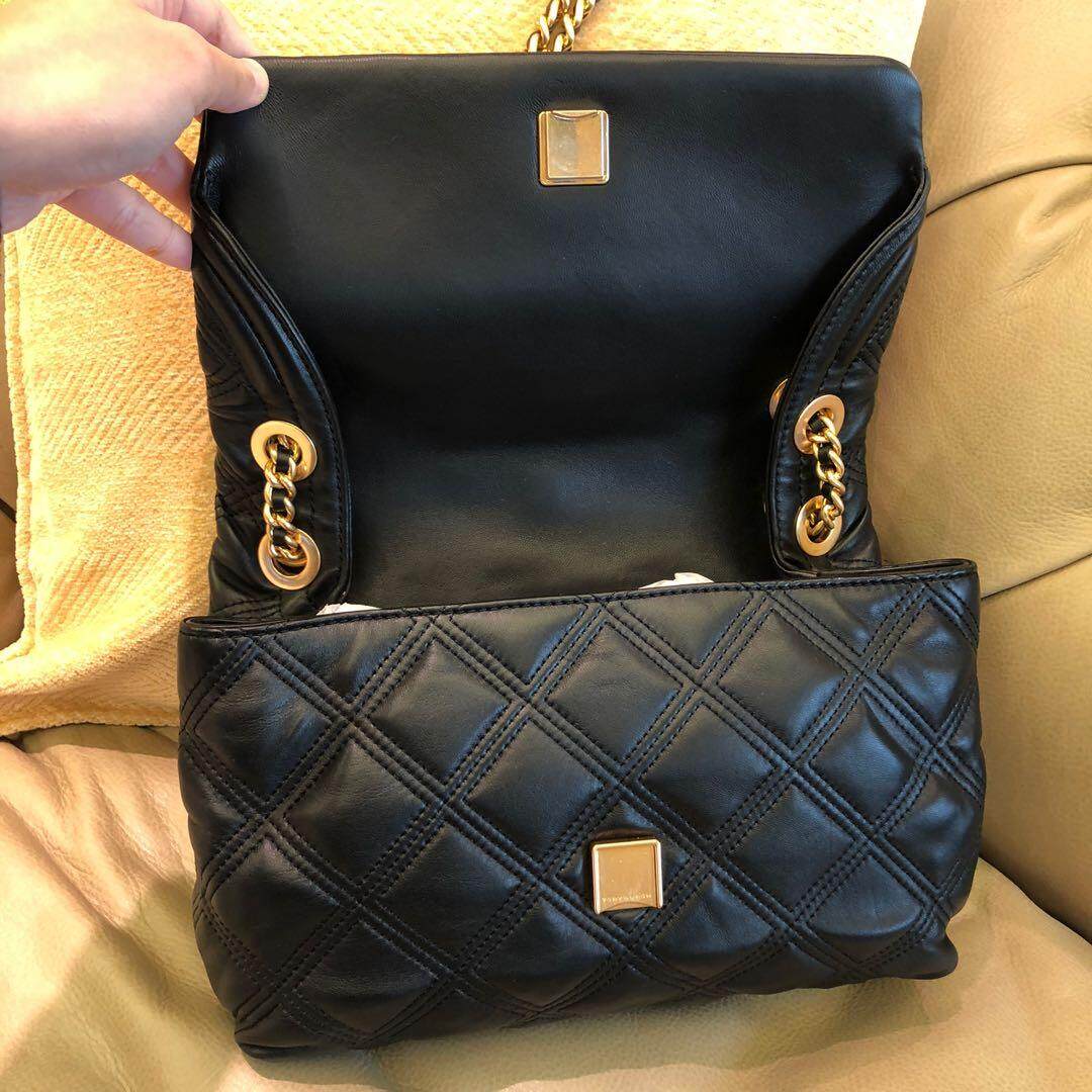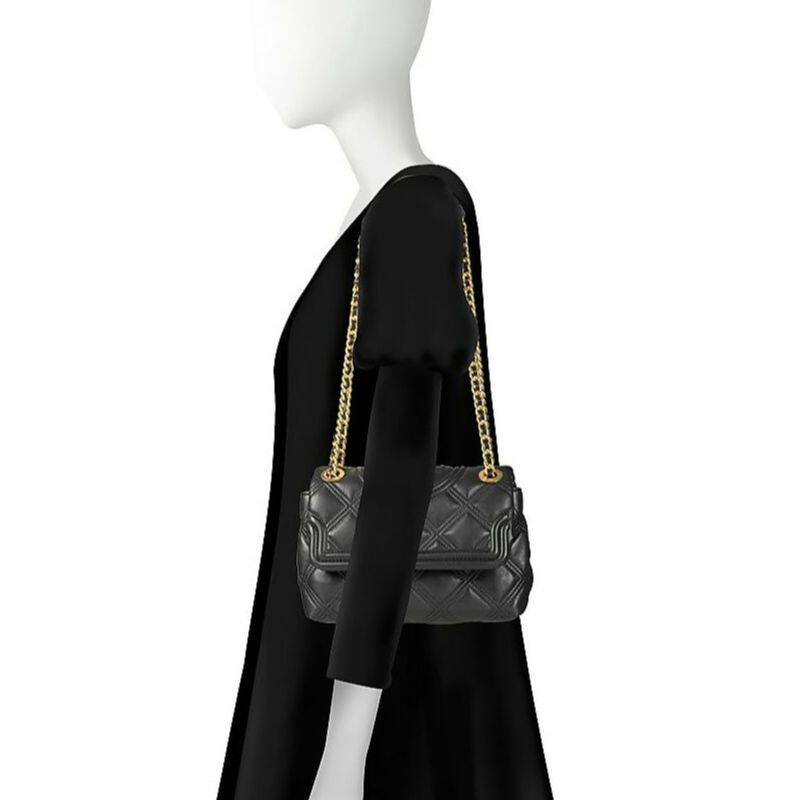 adjustable leather and chain strap, embossed logo detail on flap, removable tassel detail, interior pockets, and gold tone hardware.