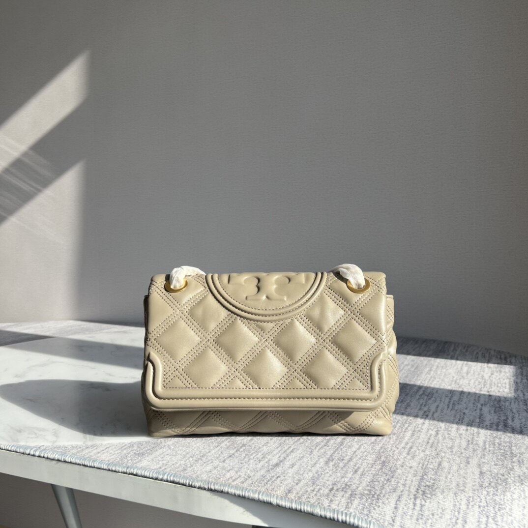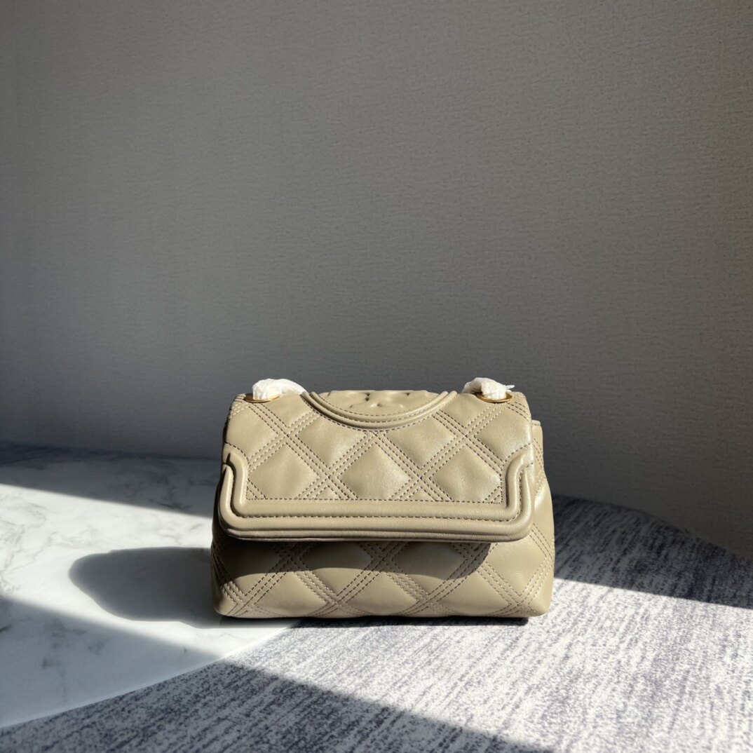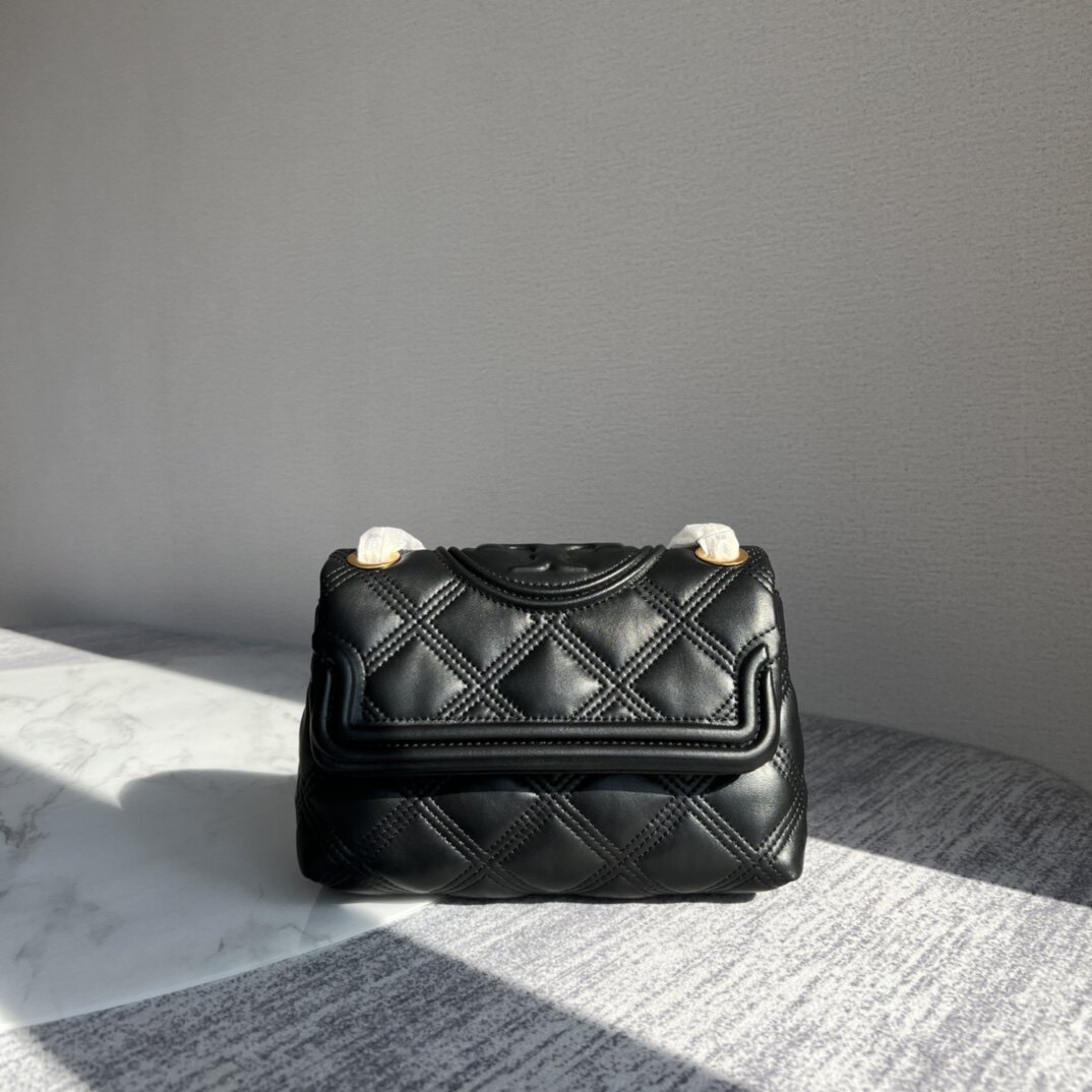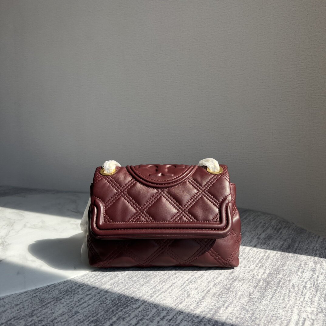 adjustable leather and chain strap, embossed logo detail on flap, removable tassel detail, interior pockets, and gold tone hardware.