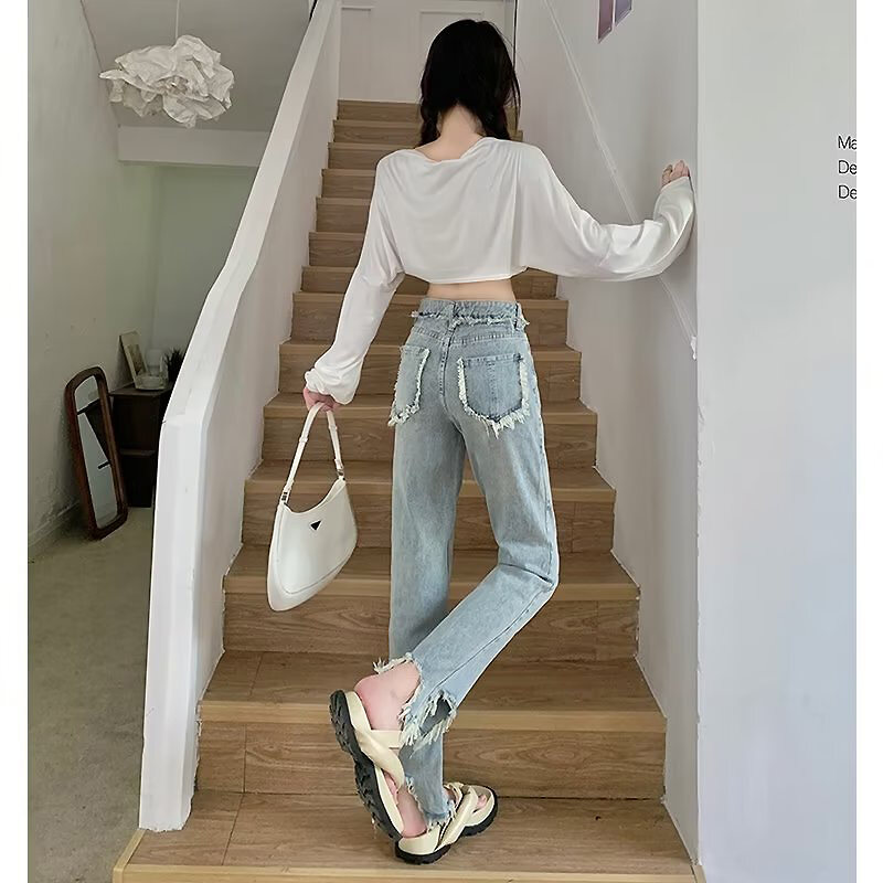 La Chebel White Straight-Cut Jeans Women's Ankle-Length Pants Spring and Autumn 2023 New Loose Pants Casual Cigarette Pants