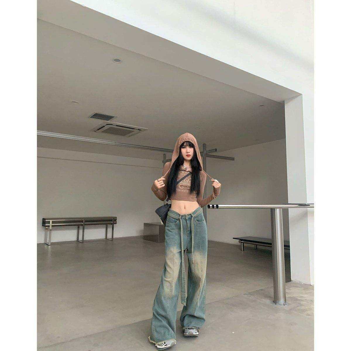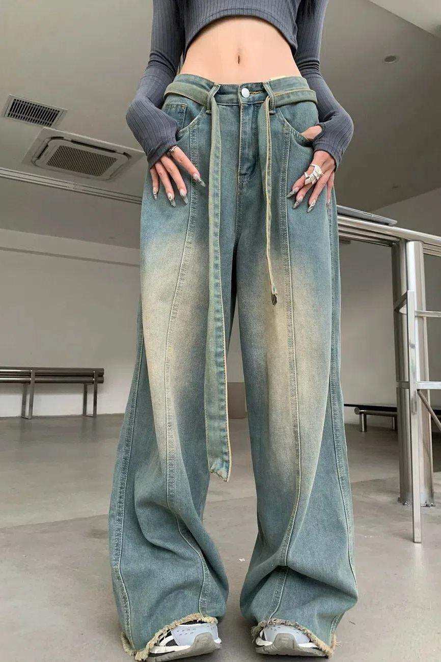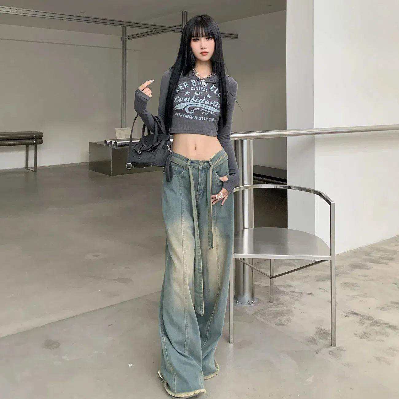 American Style Retro Vibe High Street Wide Leg Mopping Jeans Women's Spring and Summer Distressed High Waist Straight Drooping Loose Trousers