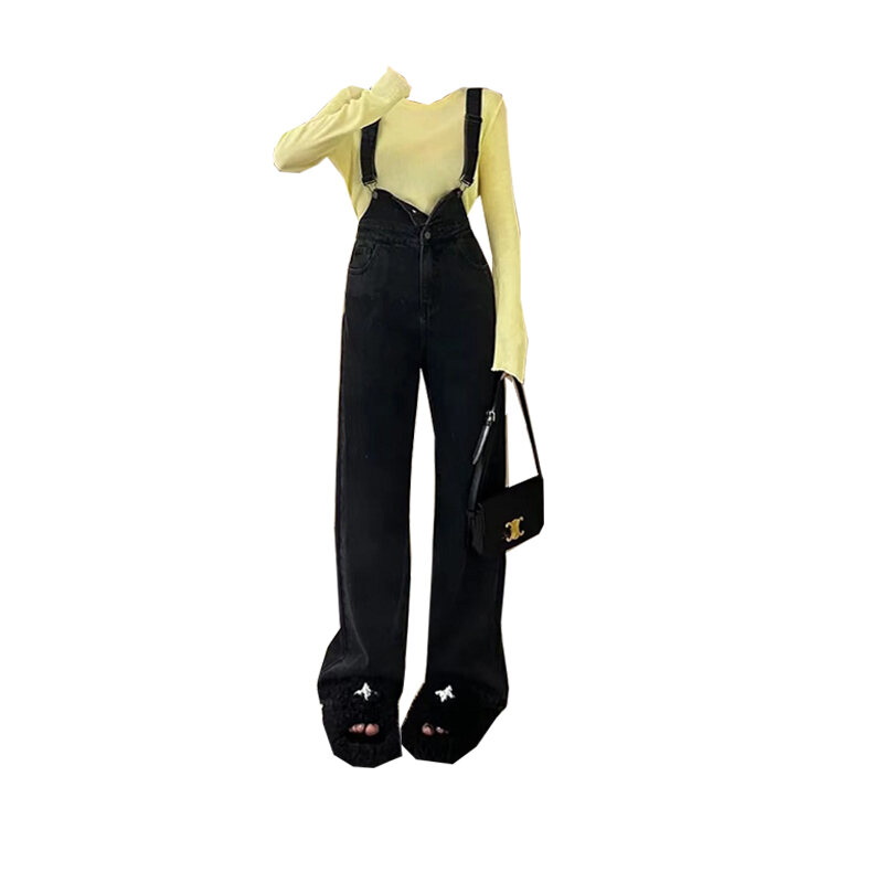 Large Size Pear Shapes Slim Looking Denim Overalls for Chubby Women Loose Belly-Covering Wide-Leg Straight Trousers