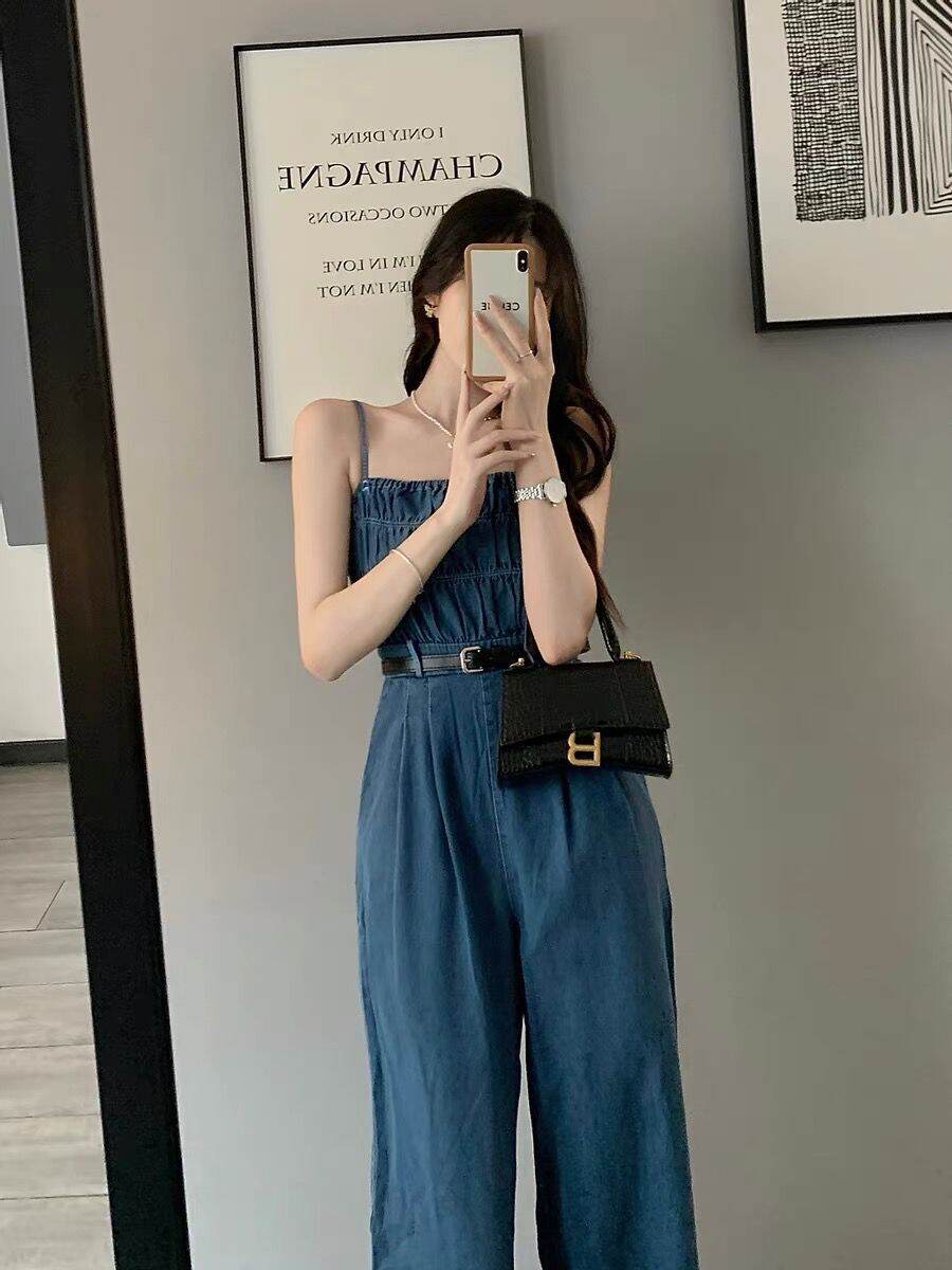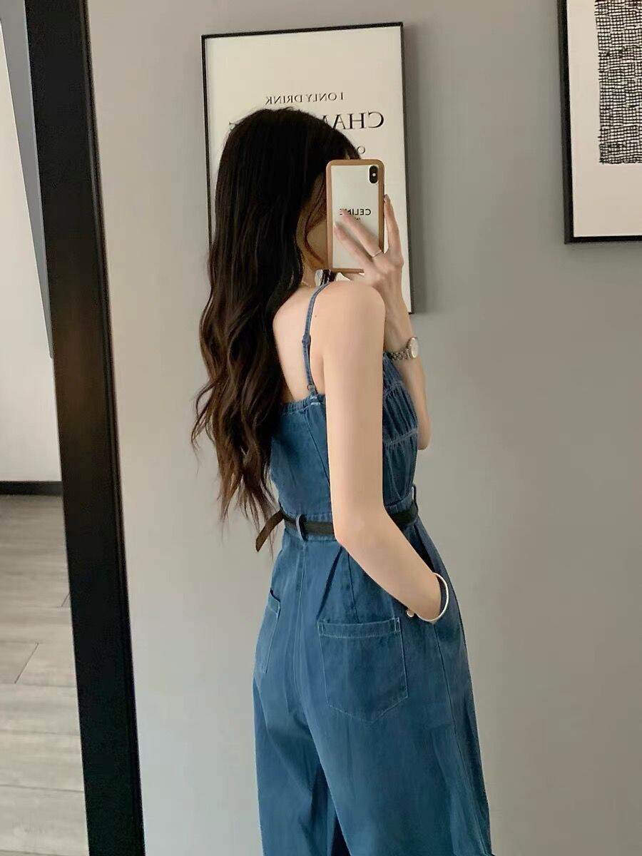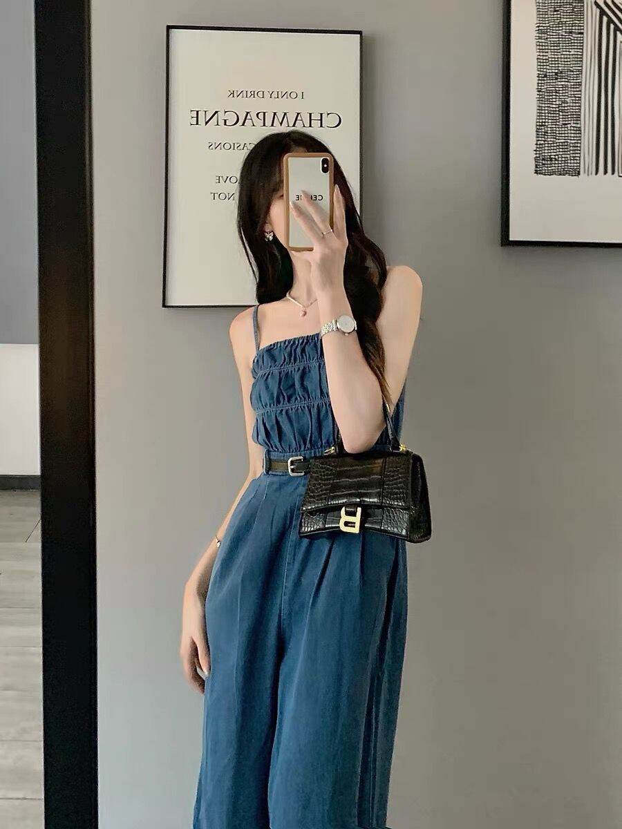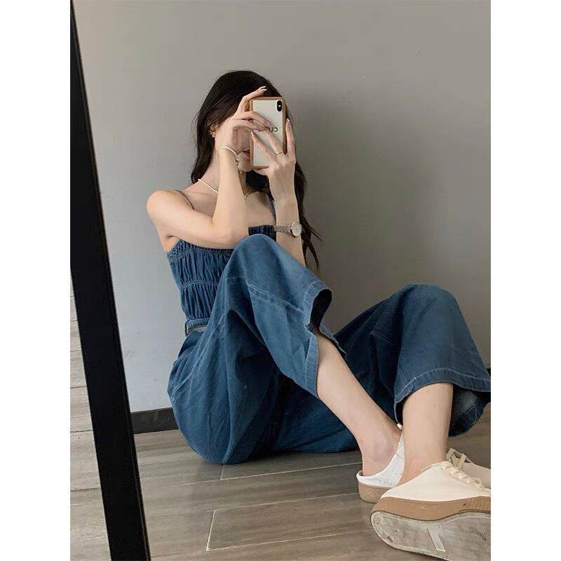 Denim Jumpsuit Women's Summer 2023 New off-Shoulder Short Wide Leg Jumpsuit Suit Waist Trimming Spaghetti Straps Jumpsuit