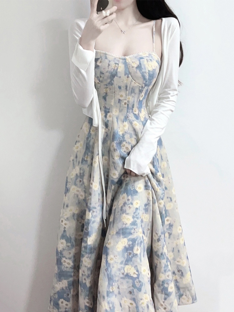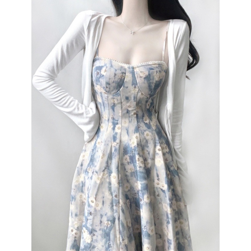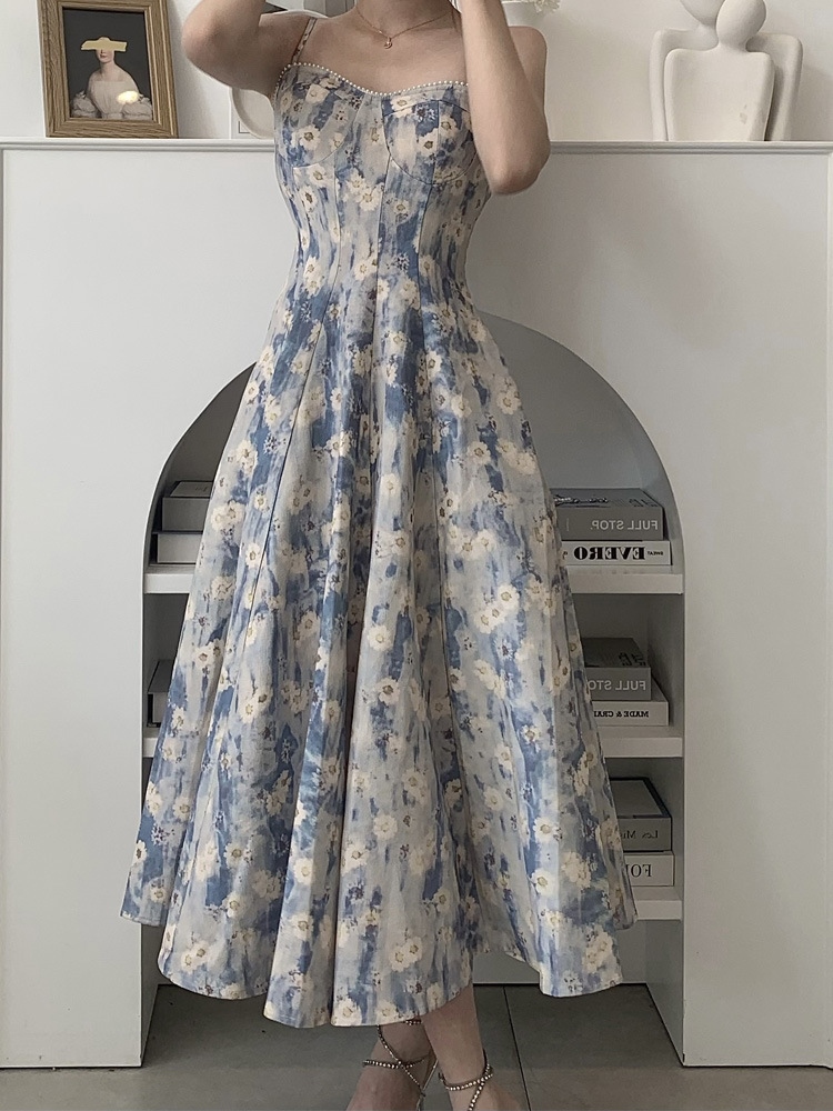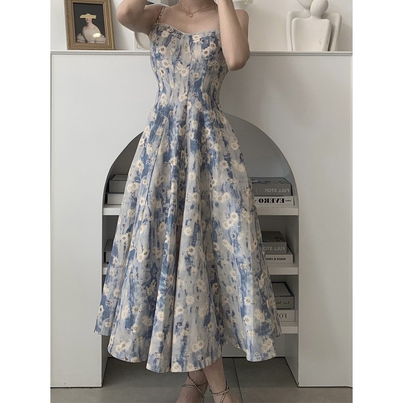 ✎☽❃ French blue oil painting long dress beach skirt floral suspender dress female 2023 summer fairy style high-end