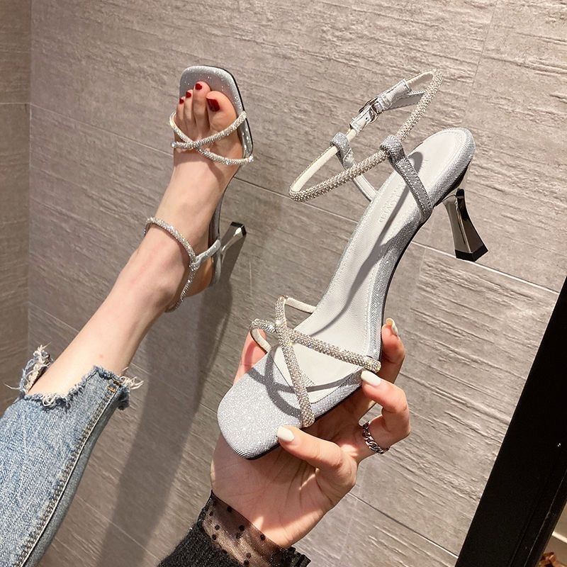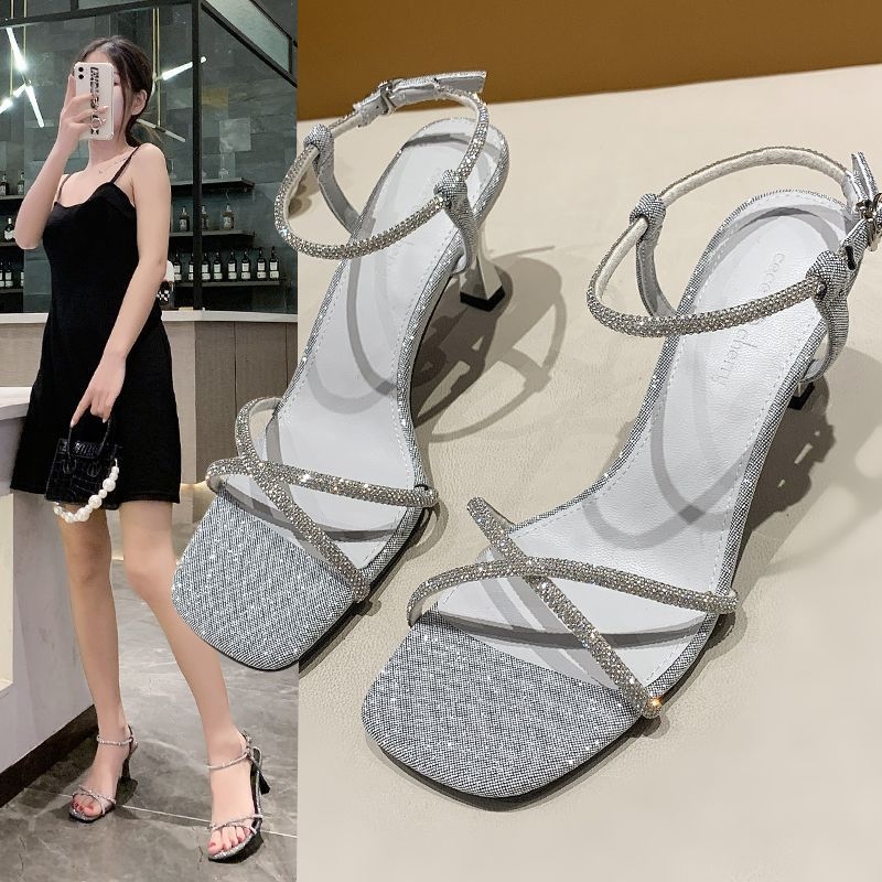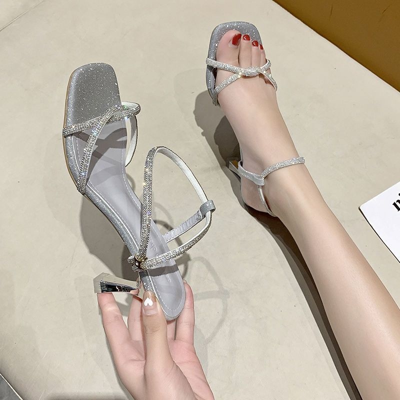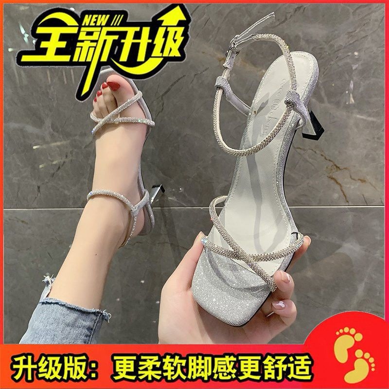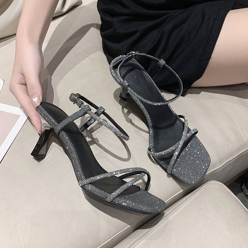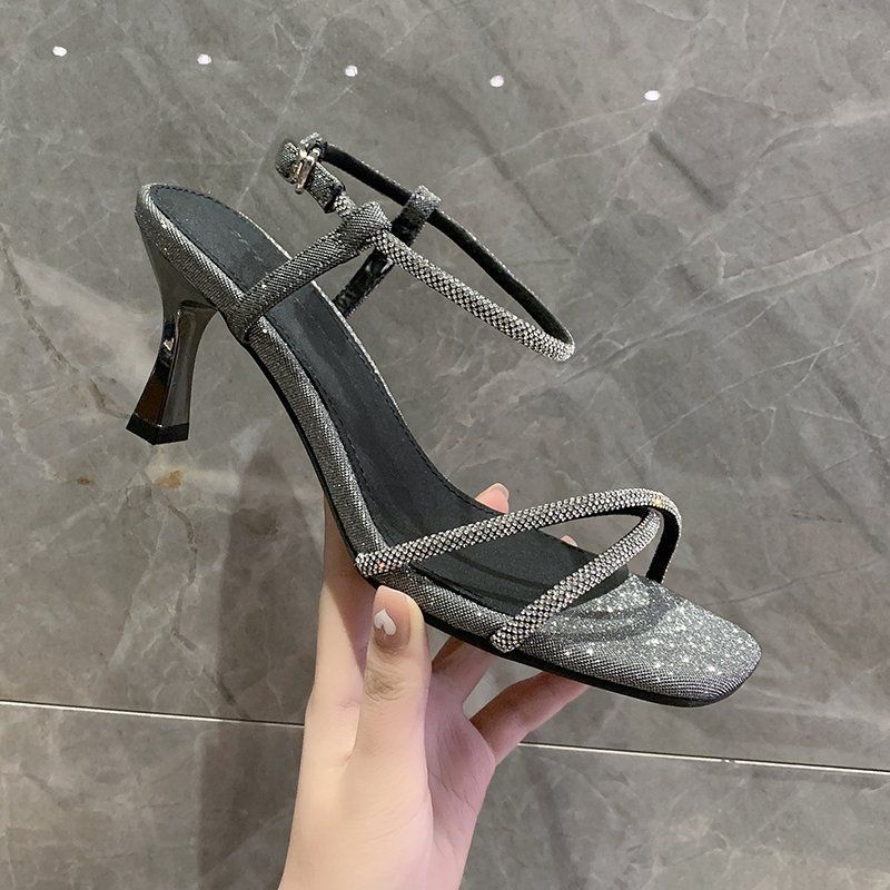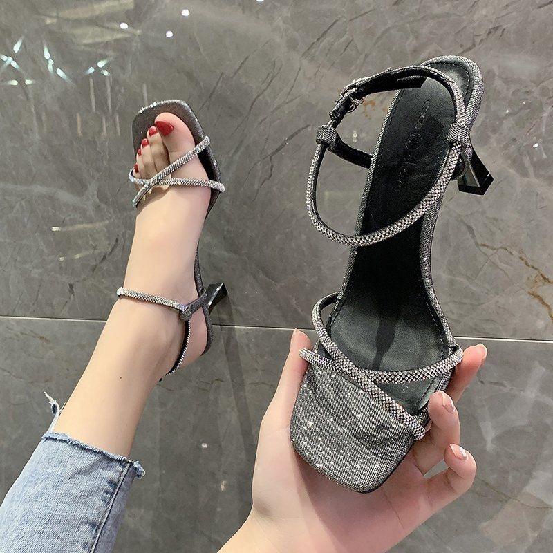2023 Women's High-Heeled Slippers New Dress Fairy Style Sandals Women's Rhinestone Stiletto Square Toe High Heels
