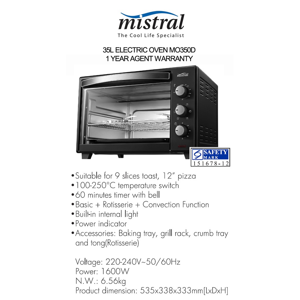 Overview •Mistral 35L Electric Oven with Rotisserie & Convection Function, Built-in internal light, 100 - 250 degree temperature selection, 60 mins Timer & Power on indicator.Features •60 Mins timer with bell and "Stay On" Setting•100 - 250 degree temperature switch•Power Indicator•Built-in Internal Light•Basic + Rotisseries + Convection Fuction•With Baking Tray, Grill Rack, Crumb Tray and tong (Rotisserie)Specifications •Capacity : 35L (Suitable for 9 slices toast, 12" Pizza)•Voltage : 220 - 240V•Frequency : 50/60Hz•Power Consumption : 1600W•Net Weight : 6.56kg•Product Dimension (L x D x H) : 53.5 x 33.8 x 33.3 cm