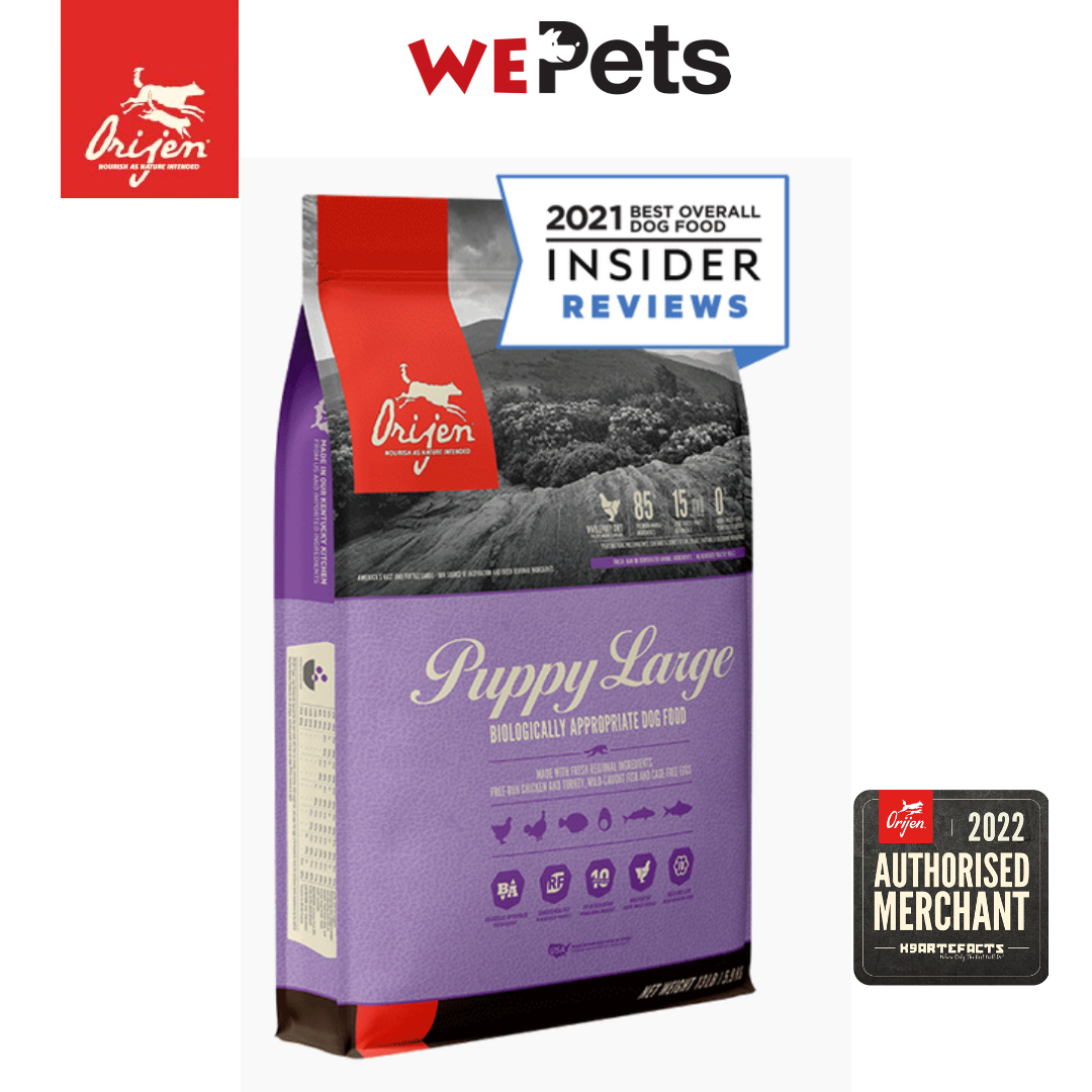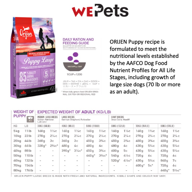- With 38% richly nourishing protein, and a limited 20% low-glycemic carbohydrates, ORIJEN nourishes large breed puppies according to their evolutionary and biological needs.