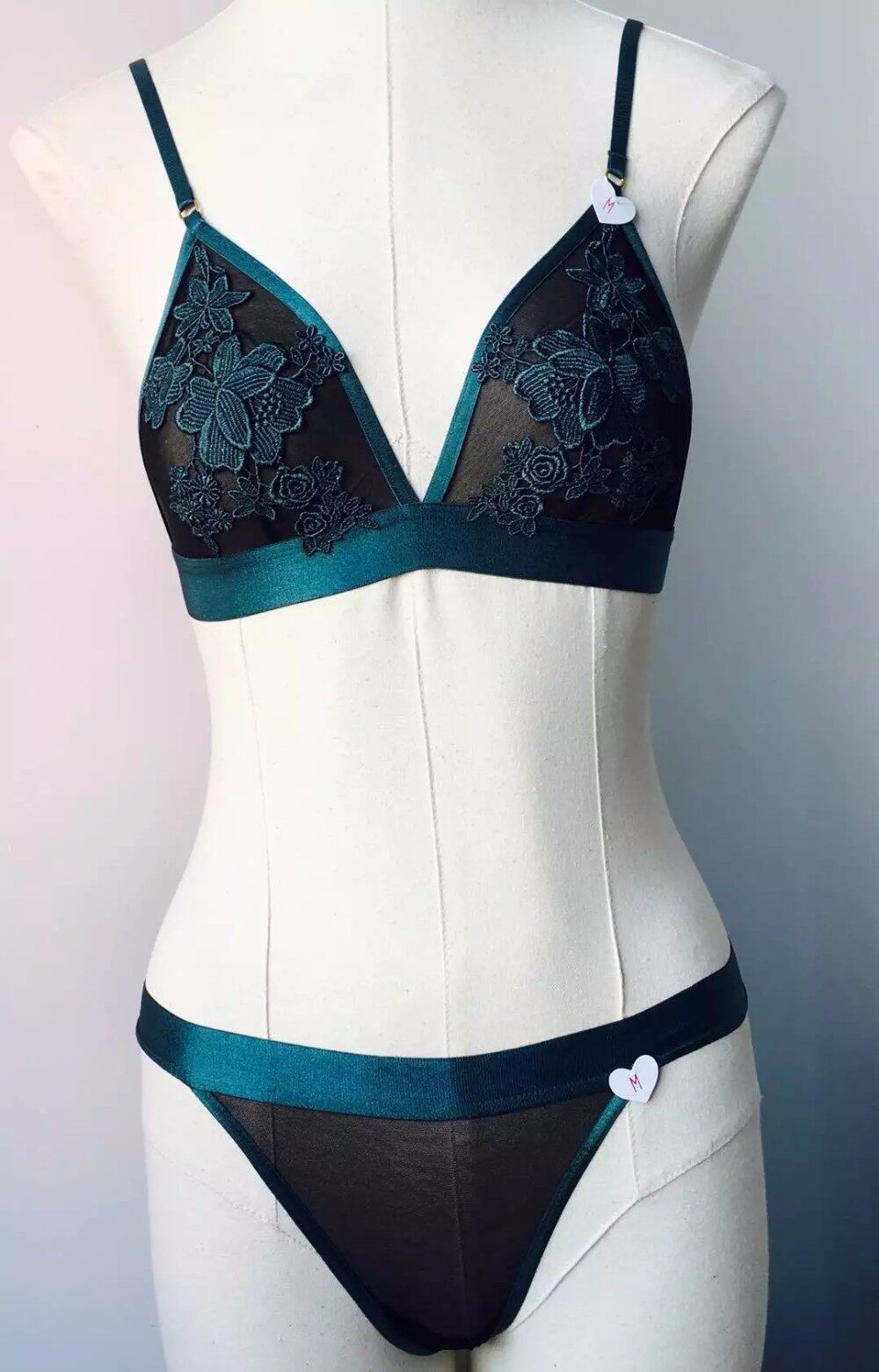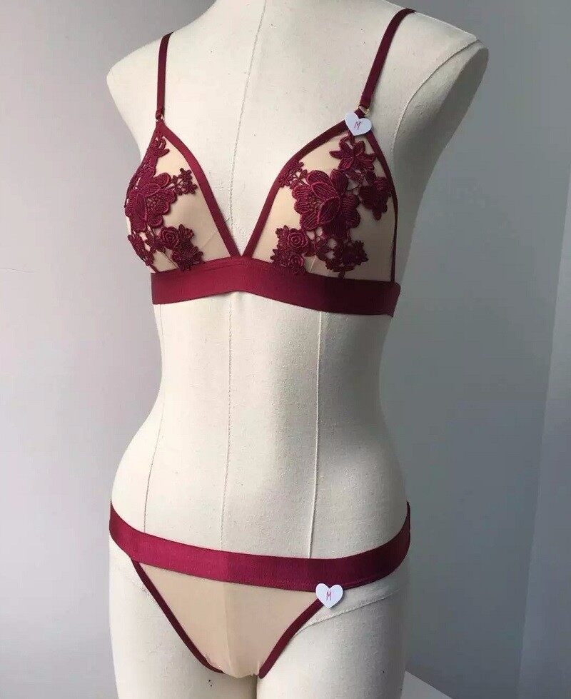 Victoria's Secret Ultra thin European and American high-grade mesh embroidery triangle cup underwear set Color contrast non steel bra set