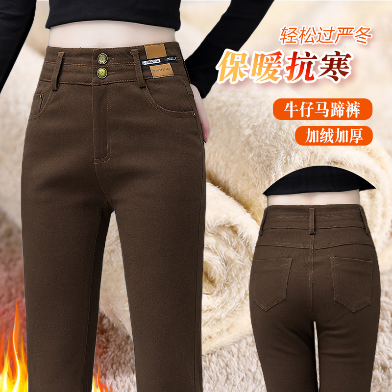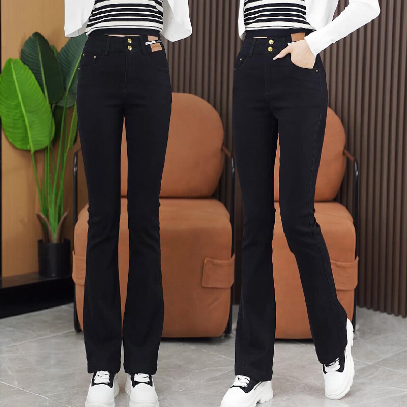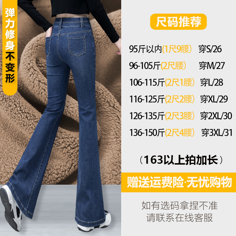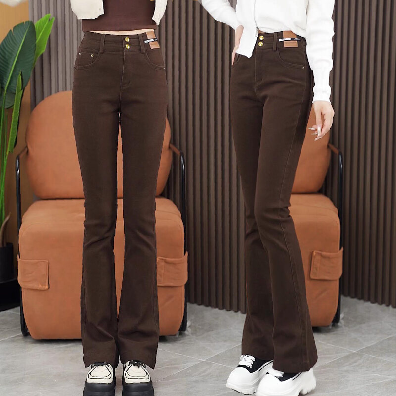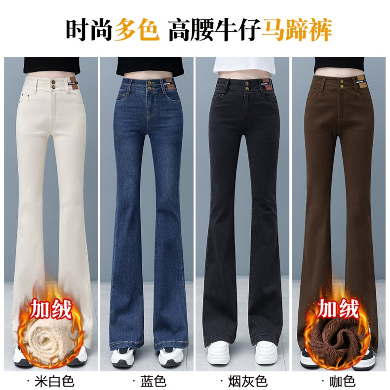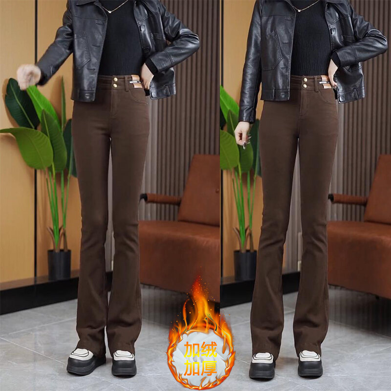 Fleece-Lined Thick High Waist Denim Bootcut Trousers Women's 2023 Winter New Fashion All-Match Slim and Tall Looking Horn Long Pants