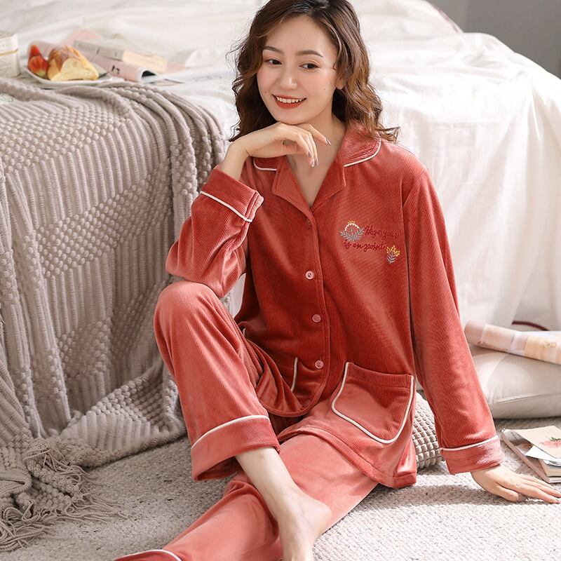 Pajamas Women's Autumn and Winter Coral Fleece Thin Cardigan Middle-Aged Mom Warm Loungewear Winter Island Velvet Suit