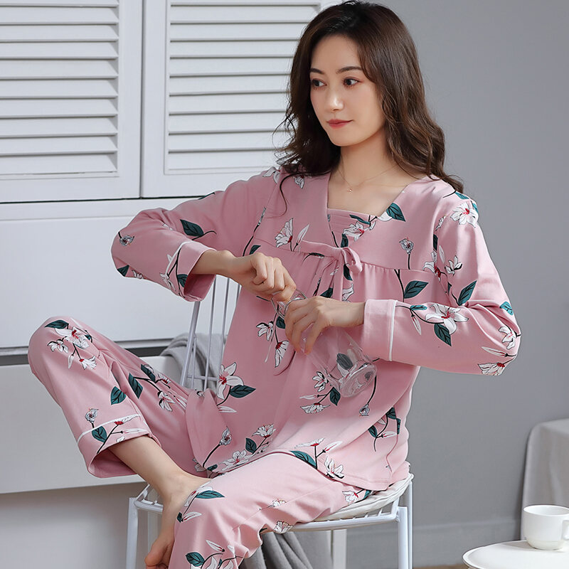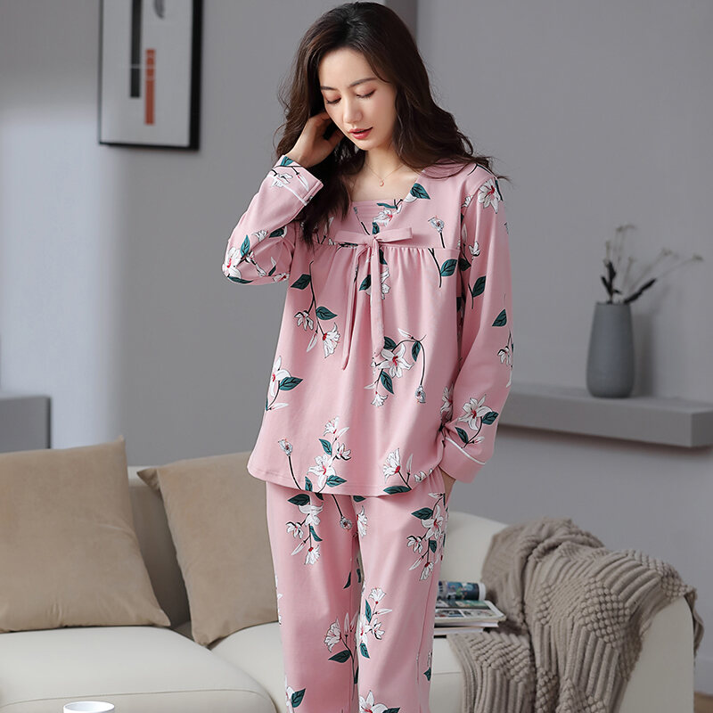 Pajamas Women's Spring and Autumn 2022 New Cotton Long-Sleeved Printed Large Size Loose Home Wear Middle-Aged Mom Suit