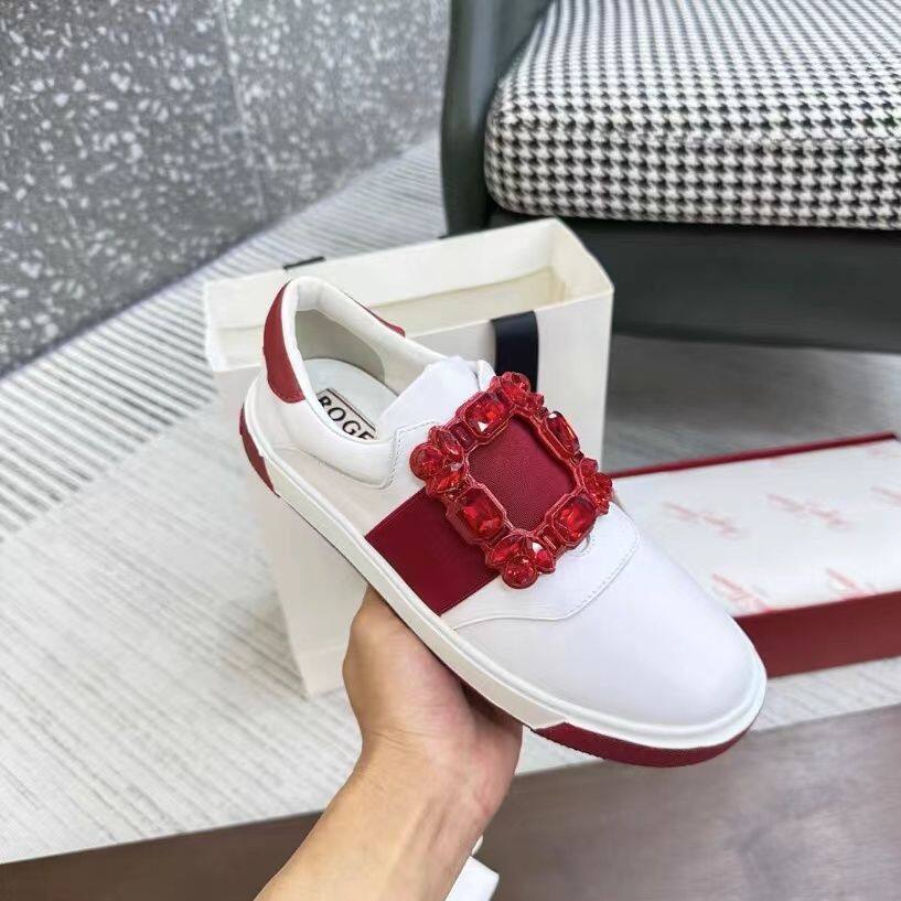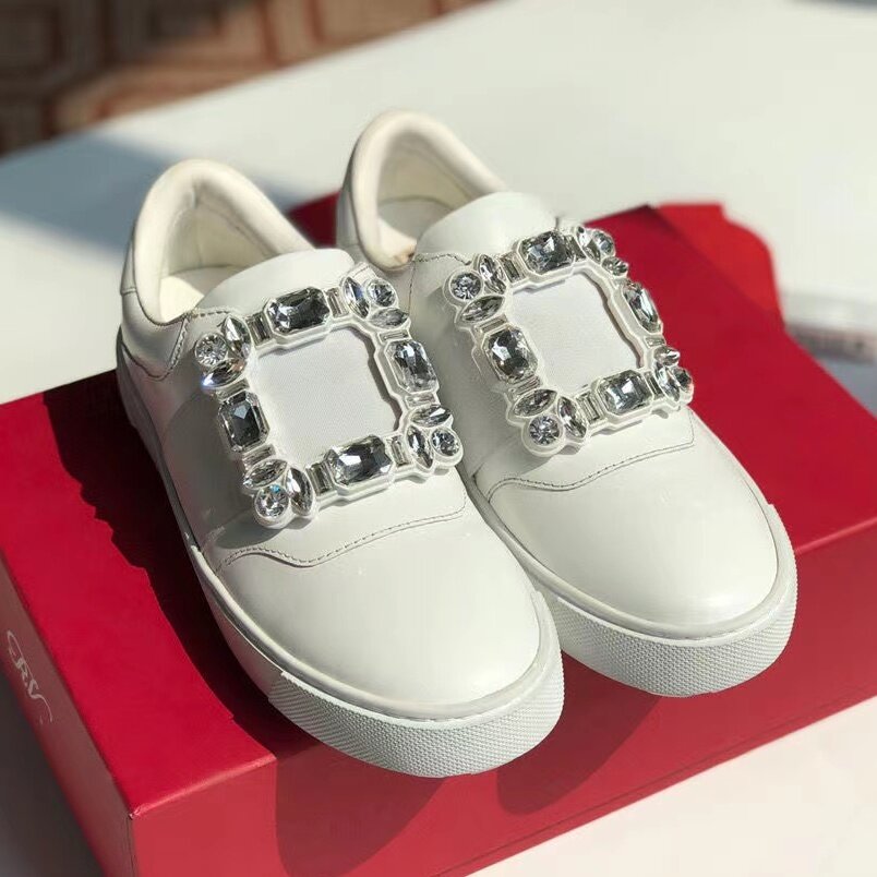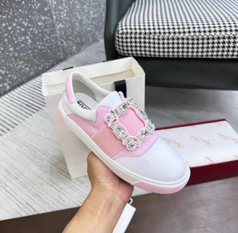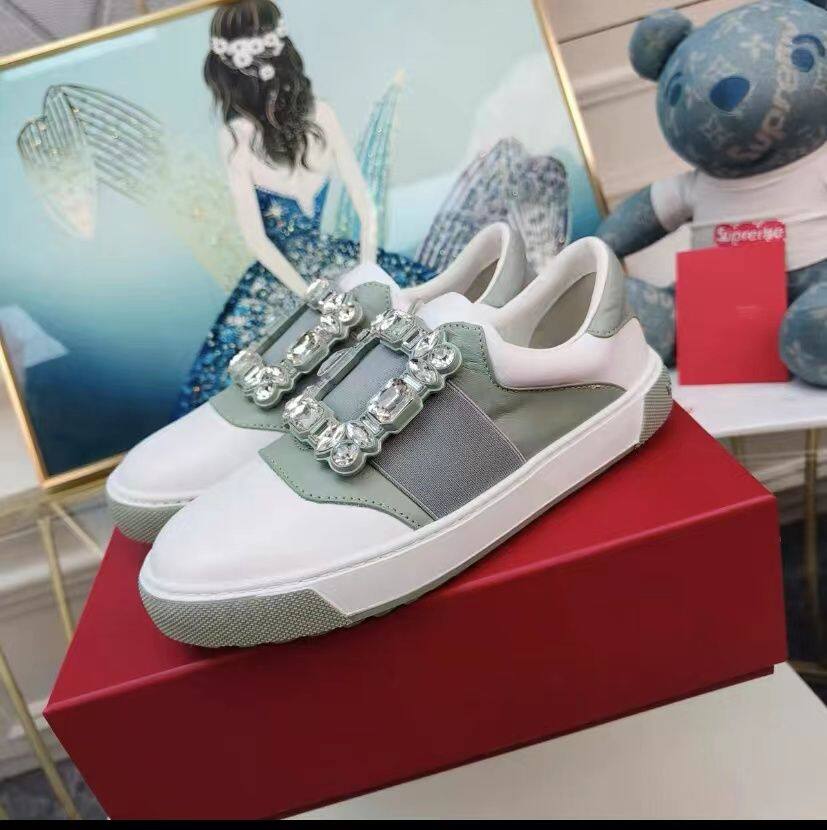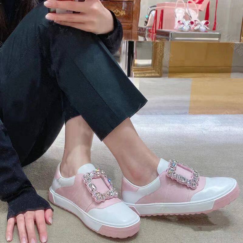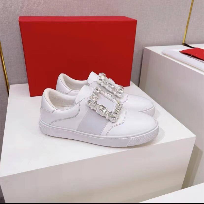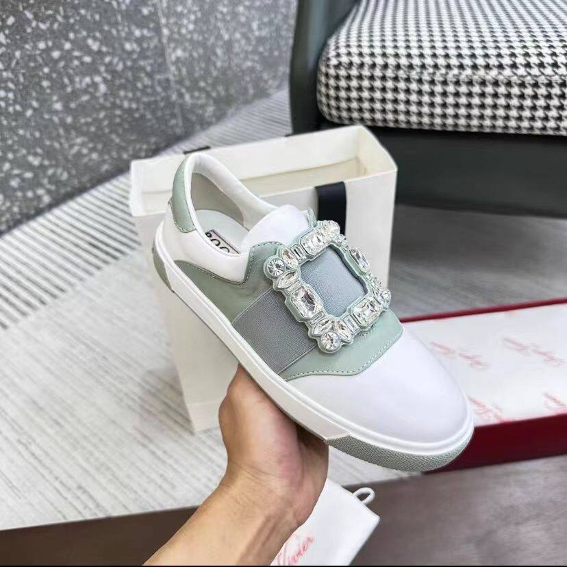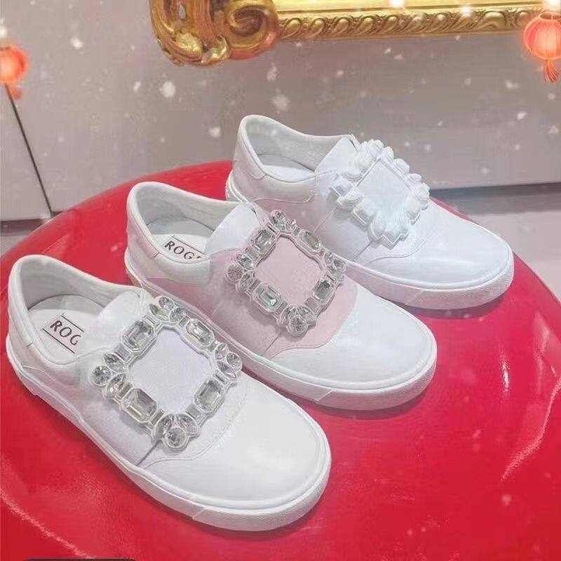 New high-definition 2023 rhinestone square buckle round toe roger vivierˉsports women's shoes slip on soft flat bottom casual white shoes