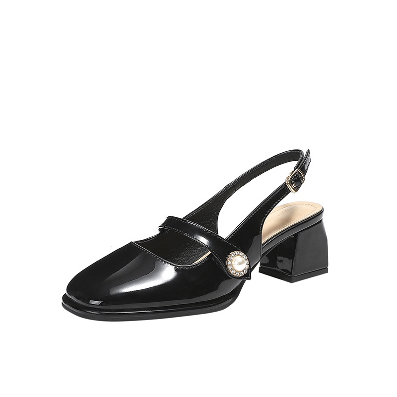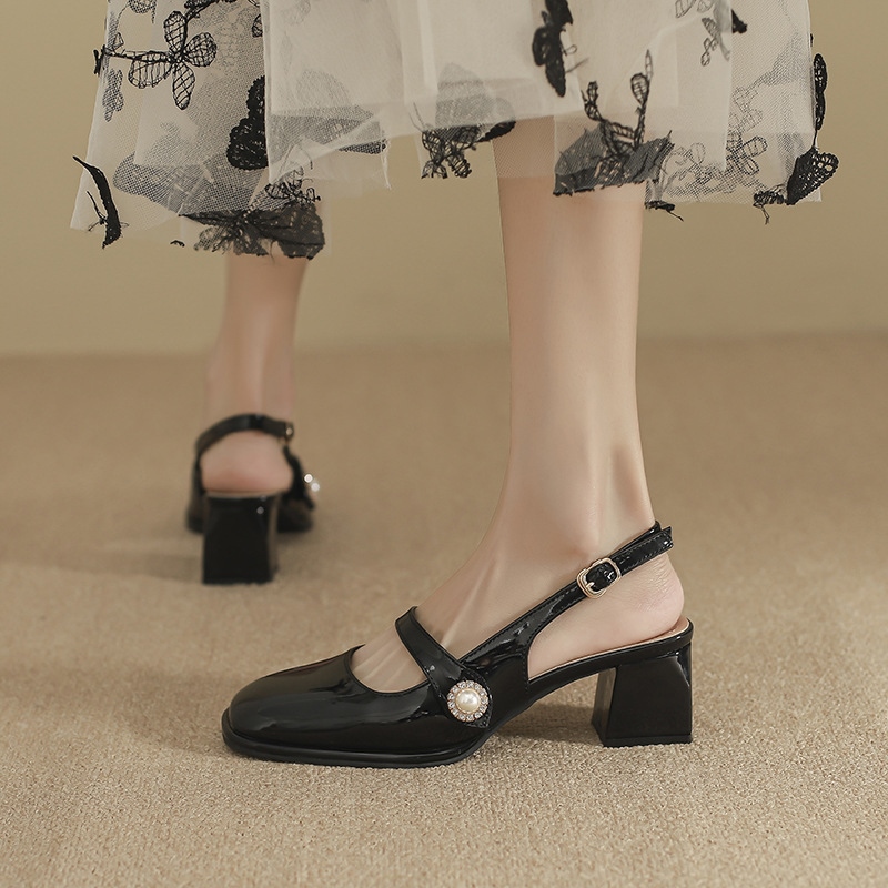 otou s women's chky heel medium heel 23 summer new patent ler fairy style one word buckle back empty high heels C427☏☜