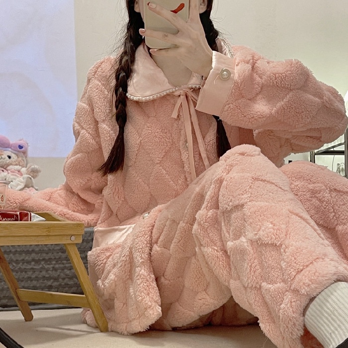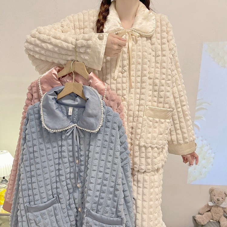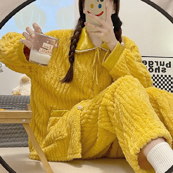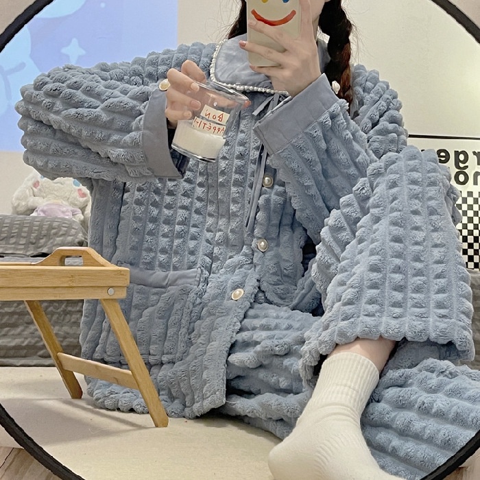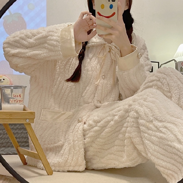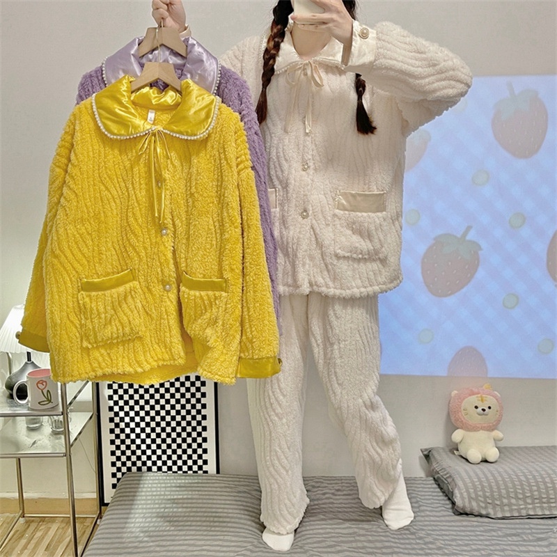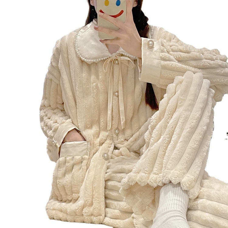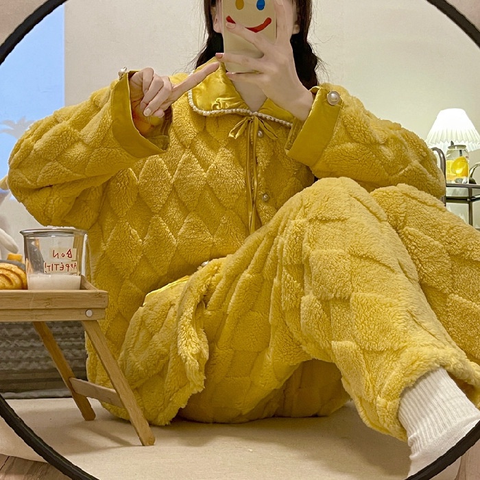 New Style Tik Tok Same Autumn Winter Thickened Flannel Pajamas Ladies Fleece Lining Outer Order Lapel Warm Homewear Suit
