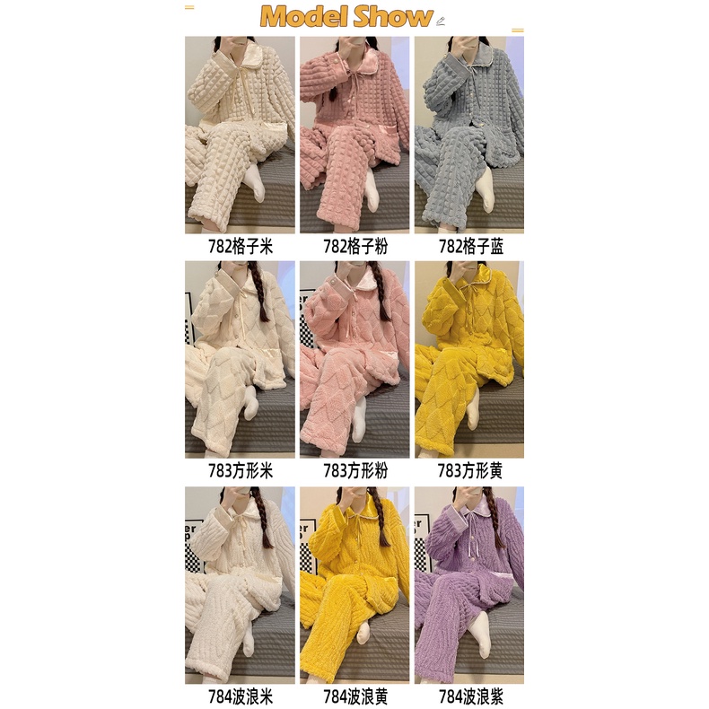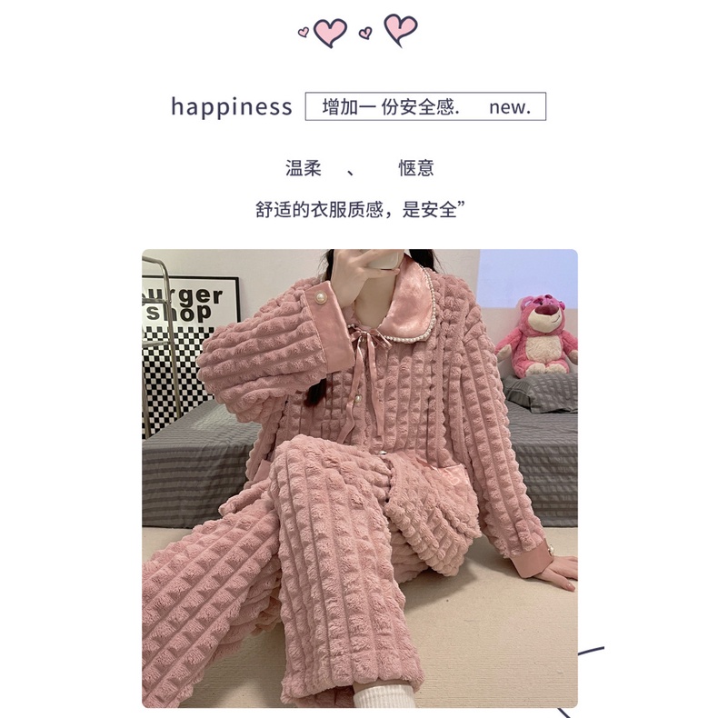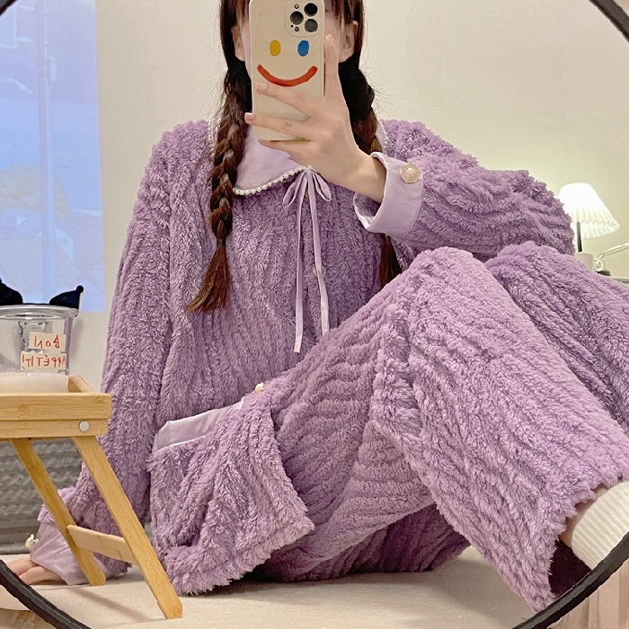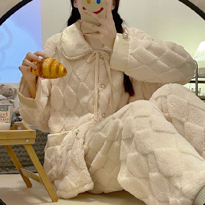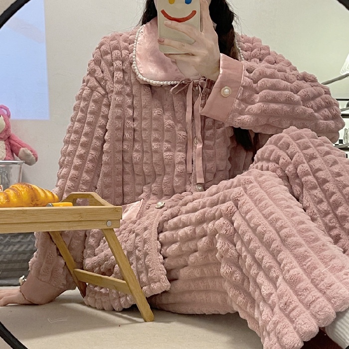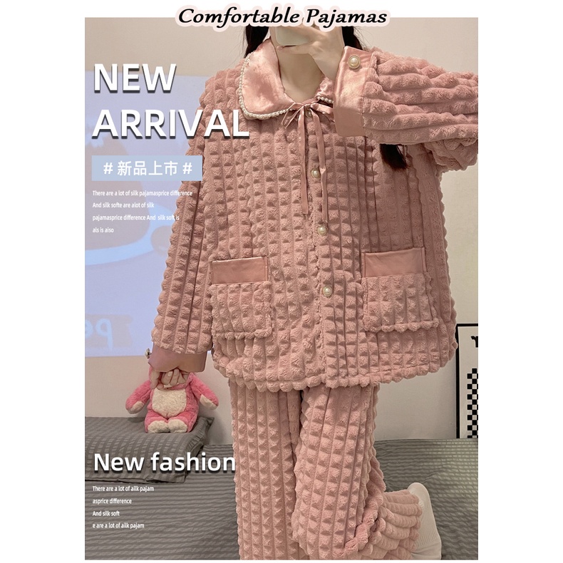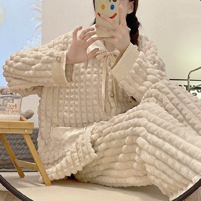 New Style Tik Tok Same Autumn Winter Thickened Flannel Pajamas Ladies Fleece Lining Outer Order Lapel Warm Homewear Suit