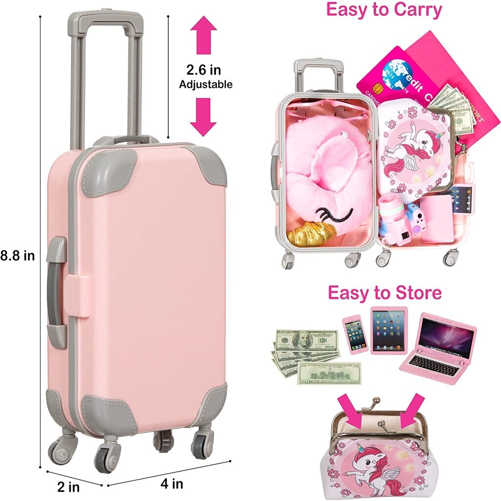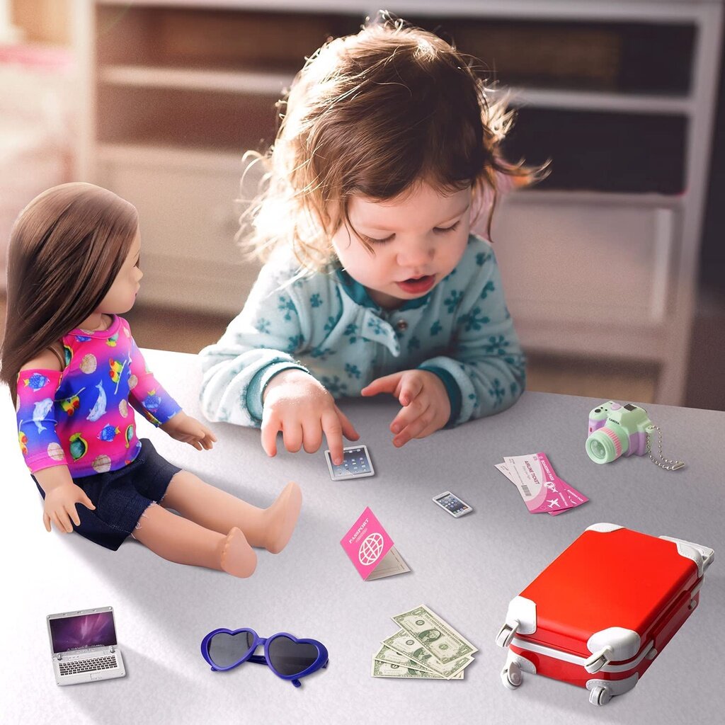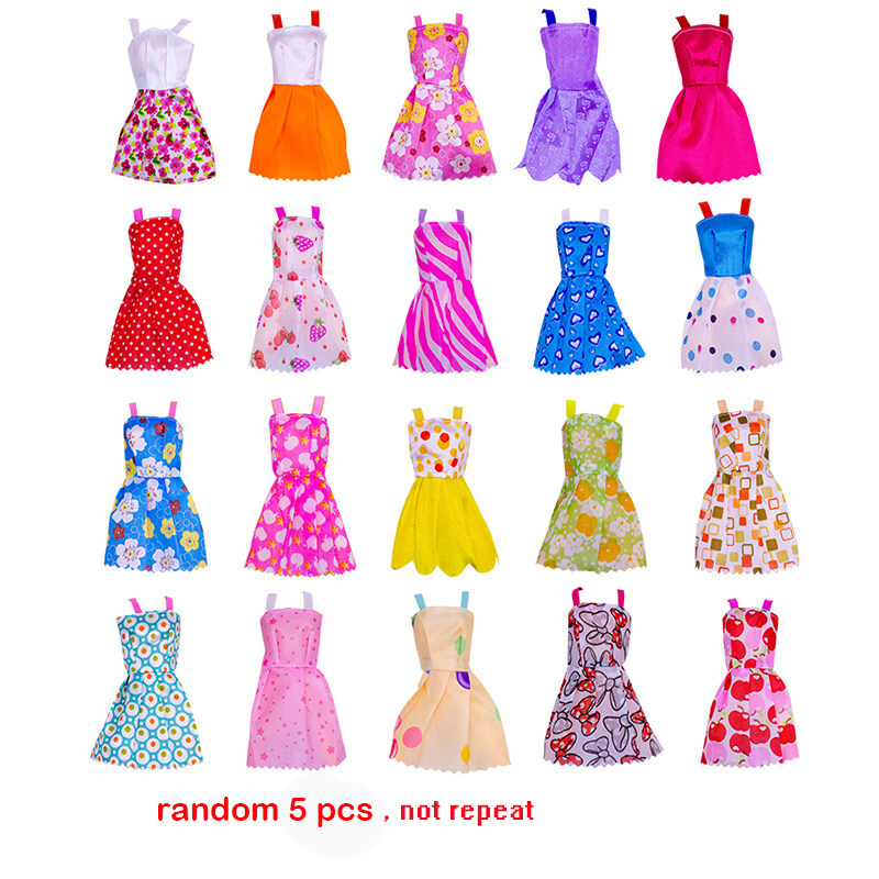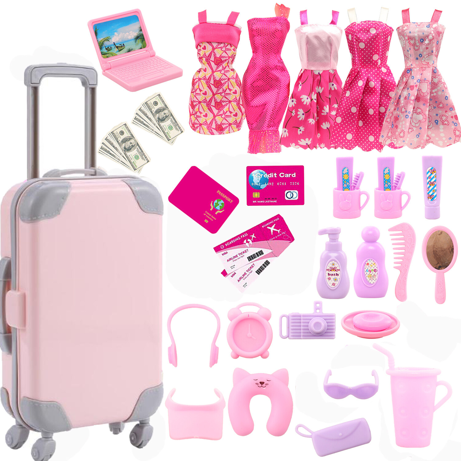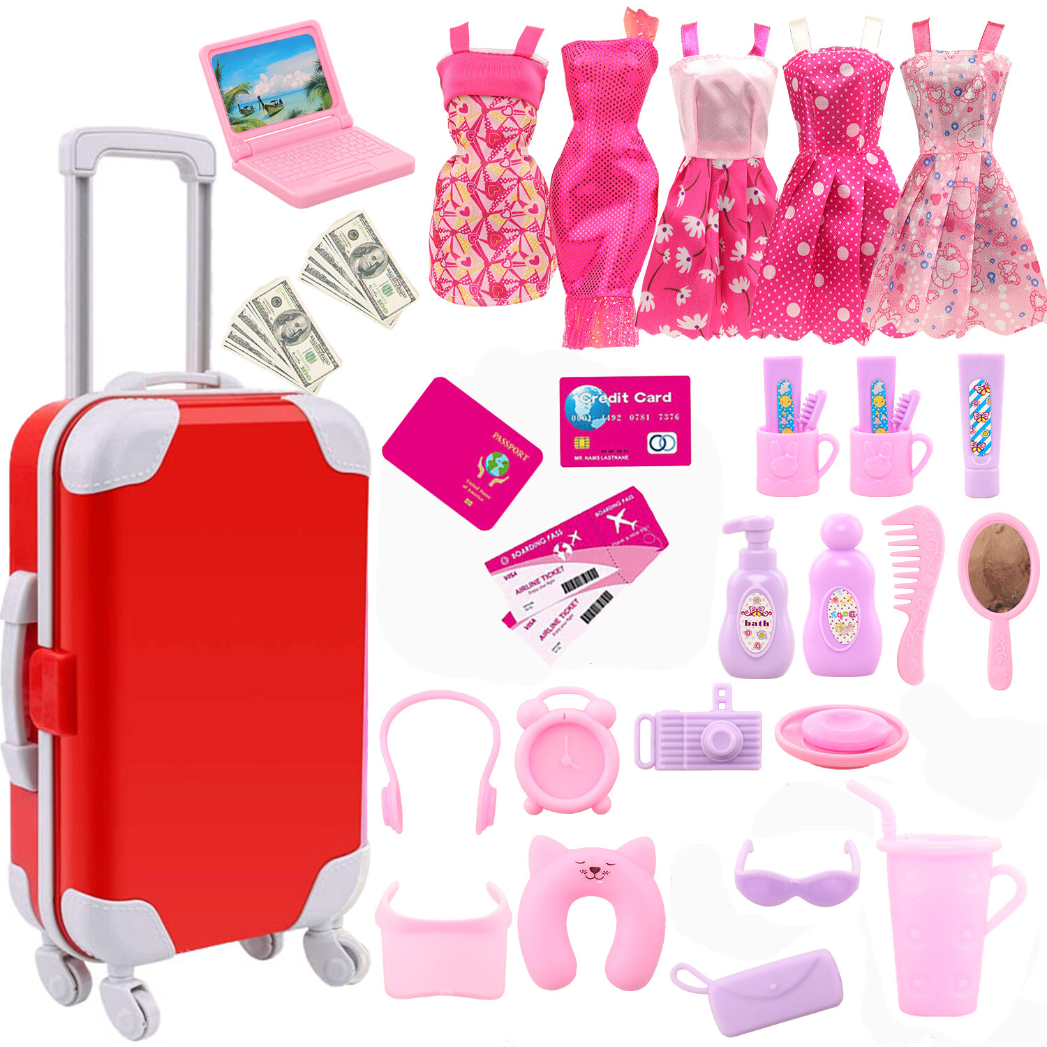 41 Items Travel Kits for Doll= Random 5 Pcs Mini Dresses for Barbie Doll+ 1 Computer + 20 Doll Accessories + 15 Toy Cards DIY