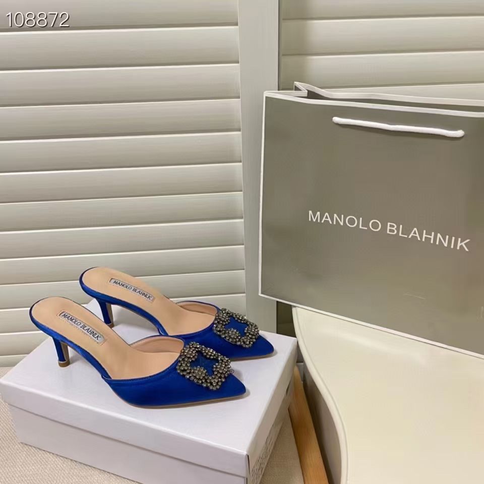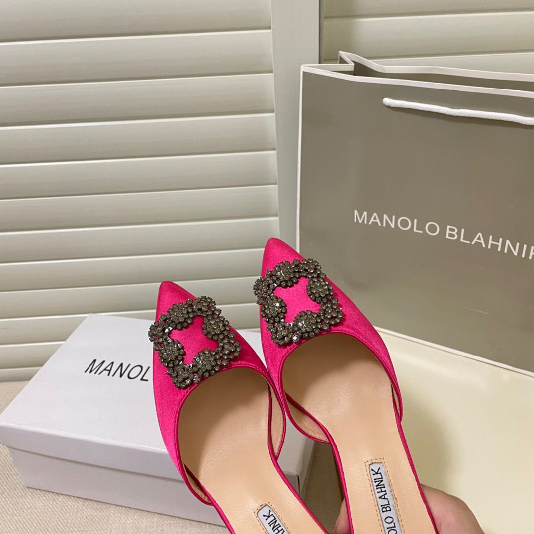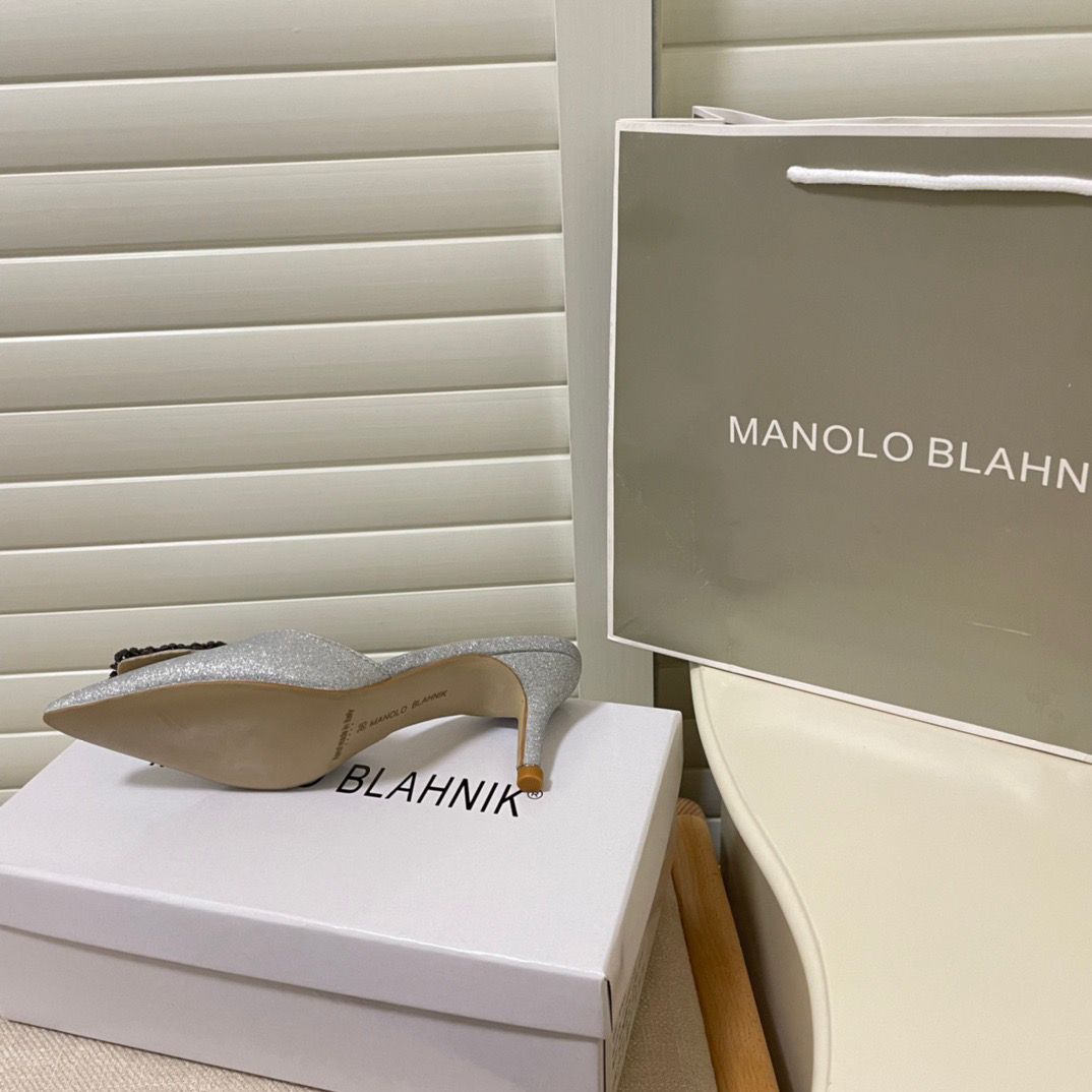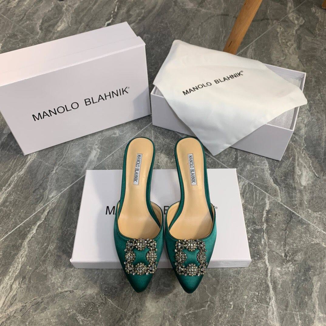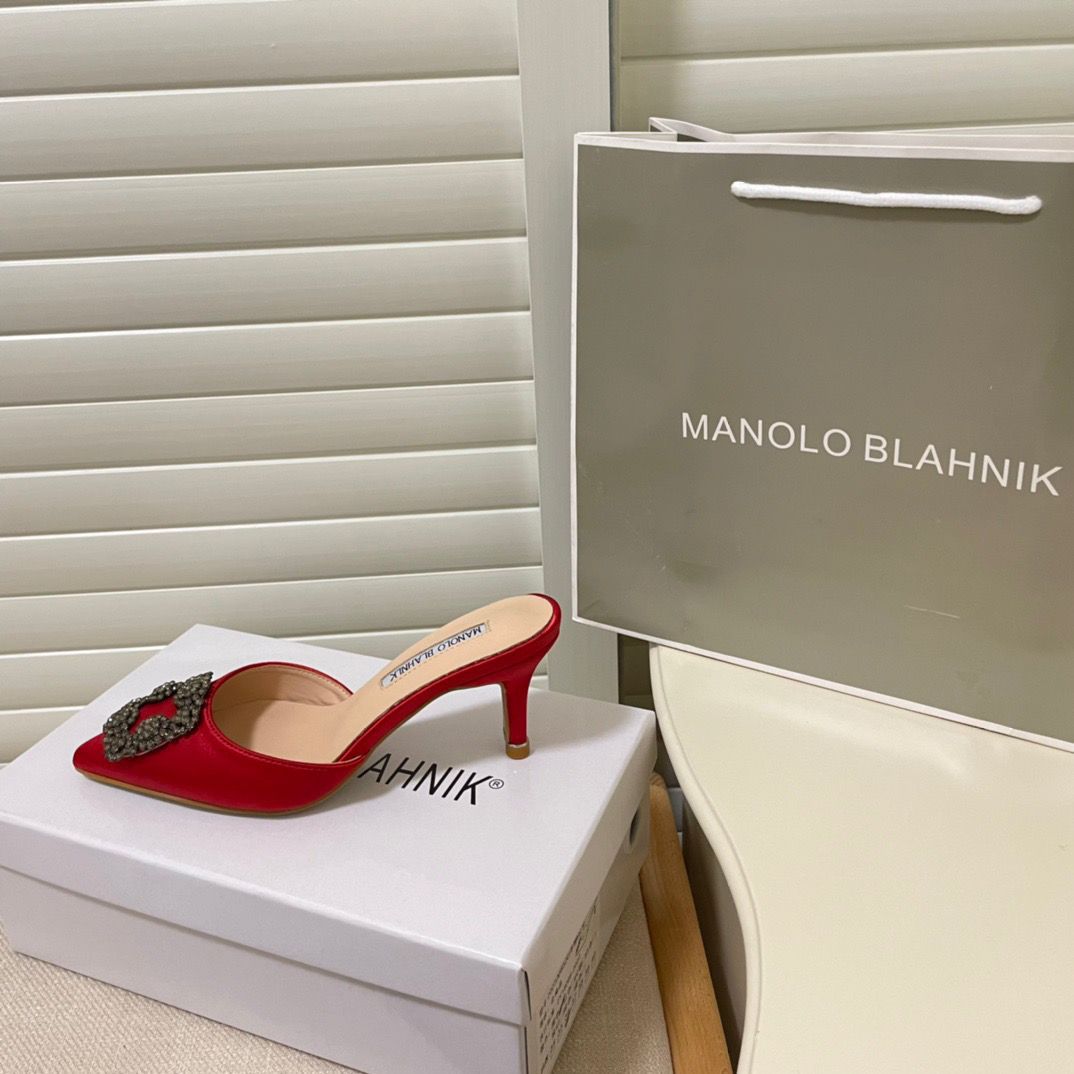 2023 Summer and Autumn New manolo blahnikˉDiamond Slippers European and American Fashion Pointed Toe Square Buckle High Heel Half Slippers