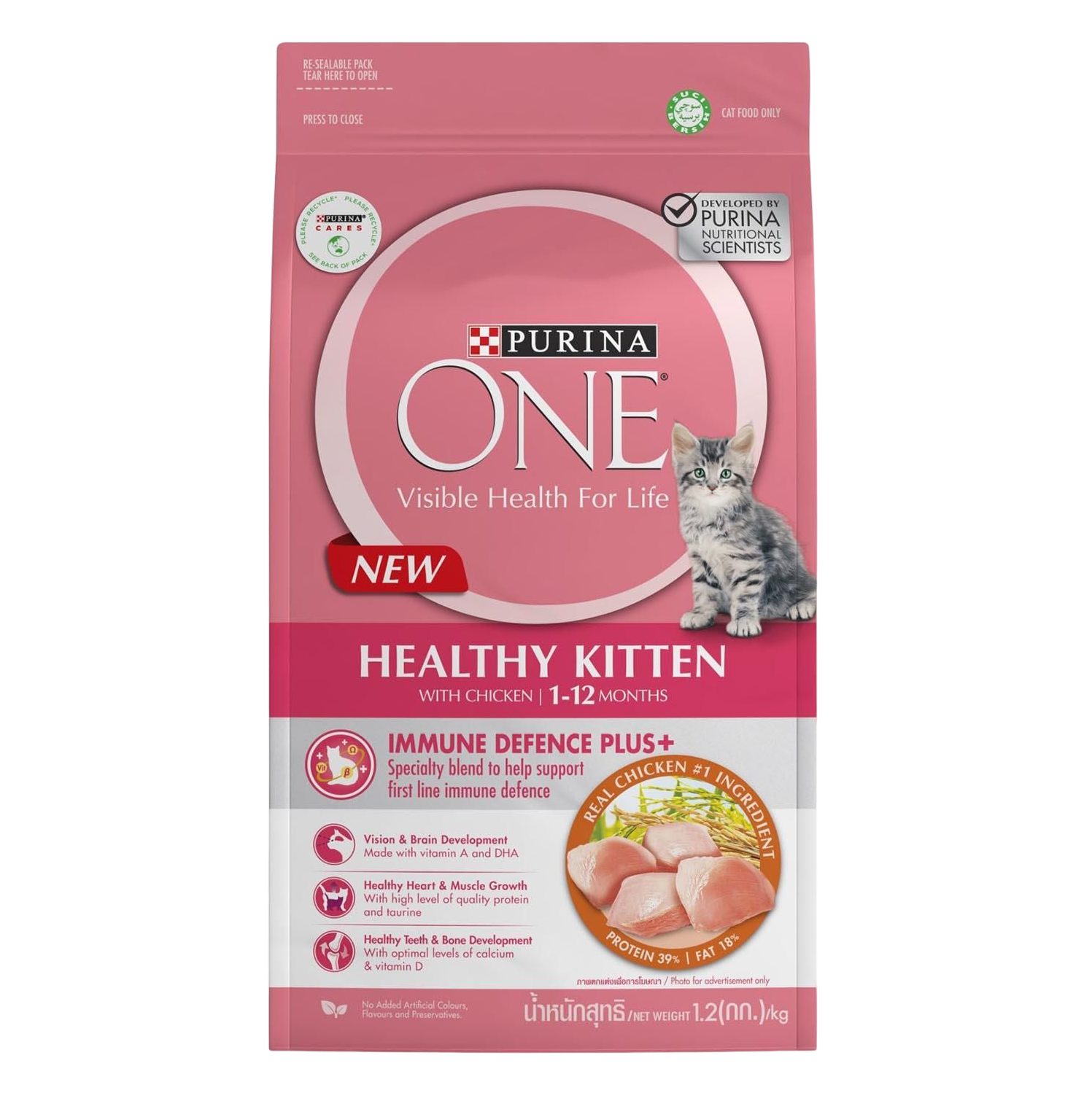 3)PURINA ONE® Healthy Kitten with Immune Defence Plus+ has been specially formulated to answer the nutritional needs of your kitten (from weaning to 12 months) and give them the optimal start for lifelong health. It also contains a specially formulated blend of Vitamins C & E, Omega 3 & 6 and beta glucans, to help support your kitten’s natural defences from the inside out. Kittens are in a phase of intense growth and development and have specific nutritional requirements.