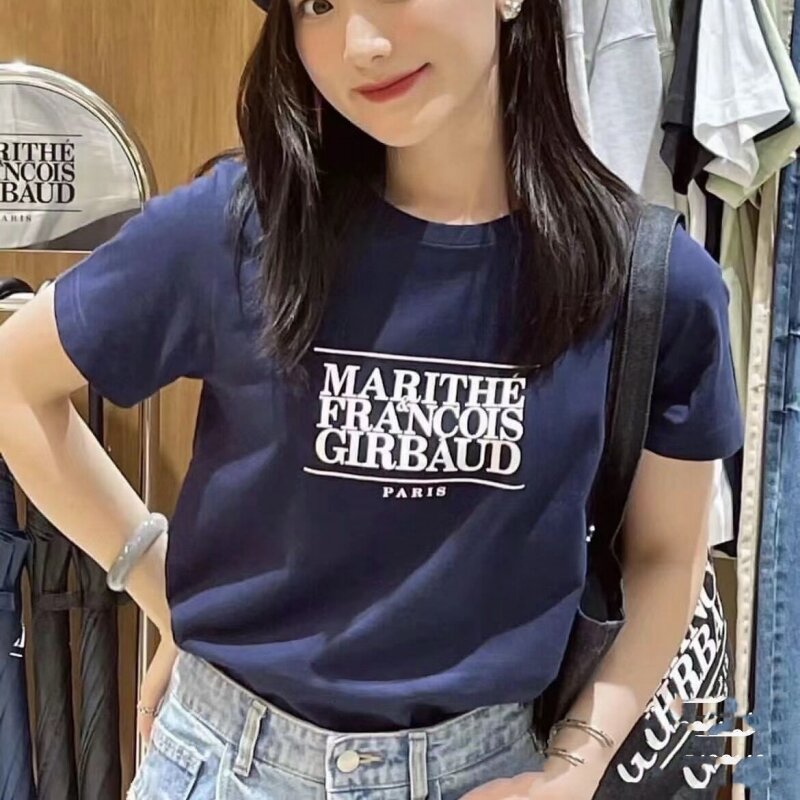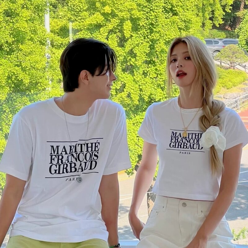 South Korea Genuine Goods Marithe Car Jingyuan Same Style Silm Shoulder Width Loose Slim Looking Ins Style Letter Short Sleeve Men and Women Summer